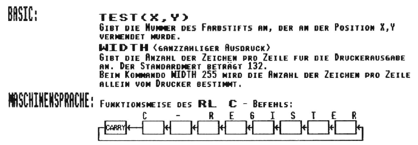 Andernfalls wird getestet, ob der Drucker zur Ausgabe des Zeichens bereit ist. Ist dem nicht so, wird der ganze Vorgang wiederholt. Ansonsten wird das Zeichen ausgegeben und zum Hauptprogramm zurückgekehrt (Zeile 660). Danach gibt der Drucker in den Zeilen 250 bis 280 die 128 Leerzeichen aus. Die nun folgenden Zeilen 300 bis 530 werden nun 640mal wiederholt. Sie wandeln die Bildpunkte auf dem Bildschirm in Grafikzeichen um, die dann zum Drucker geschickt werden. Besonders die Zeilen 300 bis 370 sind wichtig: Sie entsprechen der Zeile 110 im BASIC-Hardcopyprogramm. Zuerst wird das Unterprogramm “test" aufgerufen. Dieser Programmteil prüft das Vorhandensein eines Punktes an bestimmten Koordinatenpunkten. Wenn ein Punkt vorhanden ist, so ist das Carry-Flag gesetzt, ansonsten ist es zurückgesetzt. Zeile 340 schiebt nun den Wert des Carry-Flags links in das C-Register. Das gleiche geschieht nun mit den darunterliegenden Bildpunkten. Somit hat das C-Register am Schluß den Wert des auszugebenden Zeichens. Dieses “Schieben“ nach links innerhalb eines Registers entspricht übrigens immer einer Multiplikation mit einer bestimmten Zweierpotenz. Abbildung 4 veranschaulicht Ihnen die Funktionsweise des RLC-Befehls. Somit sind die Zeilen 330 bis 370 im MC-Programm analog zu Zeile 110 im BASIC-Programm. Bevor das Zeichen zum Drucker geschickt wird, folgt die Auswahl der ersten vier Pixel, sofern die letzte Druckzeile gerade bearbeitet wird (Zeile 450). Ist das Programm mit einer Druckzeile fertig, springt es in die nächste Druckzeile, indem von der y-Koordinate 7 Pixel abgezogen werden (Zeilen 540 und 550). Wenn alle 29 Druckzeilen ausgedruckt worden sind, kehrt das Programm ins BASIC zurück. Obwohl das MC-Programm im großen und ganzen dem BASIC-Programm entspricht, ist es wesentlich schneller: Für eine Hardcopy benötigt es knapp zwei Minuten. Trotzdem könnte es noch um einiges schneller sein, vor allem wenn man für die Abfrage eines Bildpunktes eine schnellere Routine fände. Oder wie wäre es mit der Anpassung dieses MC-Programms an andere Bildschirmmodi? Das alles würde aber den Rahmen dieses Beitrags sprengen. Wenn Sie aber die Funktionsweise der Hardcopyprogramme begriffen haben, dürfte Ihnen die Lösung dieses Problems nicht mehr allzu viele Schwierigkeiten bereiten. Abschließend finden Sie noch eine Zusammenstellung aller benutzten Betriebssystemroutinen und der wichtigsten BASIC- und Maschinensprache-Befehle. Wir hoffen, Ihnen die schwierige Materie “Hardcopies“ nähergebracht zu haben und würden uns freuen, wenn dieses Thema dem Lesepublikum zukünftig weniger Kopfzerbrechen bereiten würde. Wir wünschen Ihnen noch viel Spaß beim Ausdruck Ihrer grafischen Ergüsse! (Markus Felder/cd) , CPCAI 90/03