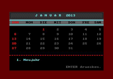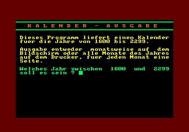 Dieses Programm erlaubt die wahlweise Ausgabe eines beliebigen Kalenders für die Jahre 1600 bis 2299 auf dem Bildschirm oder auf einem Drucker und zwar für jeden Monat eine gesonderte Seite. Die Ausgabe umfaßt die Darstellung der Monate, Wochentage und in übersichtlicher Form der Tage. Für jeden Tag wird auf dem Drucker eine Linie mit sieben Punkten ausgegeben, an deren Stelle bei Bedarf die jeweiligen Feiertage erscheinen. Erfaßt sind Feiertage, die überwiegend in allen Bundesländern begangen werden und gesetzlich geregelt sind. Außerdem können zusätzlich Geburtstage und sonstige Termine eingegeben werden, die dann bei der Druckausgabe Berücksichtigung finden. Auch die Bildschirmausgabe erfolgt monatsweise. Die Feiertage werden am unteren Bildschirmrand aufgeführt und erscheinen wie die Sonntage als rote Tageszahlen. Kalender für das Jahr 2299 Das Programm wurde für einen STAR gemini-10x Drucker geschrieben, jedoch finden sehr spezielle Befehle im Interesse der Kompatibilität und auch eine Anpassung an andere Drucker keine Anwendung. Sämtliche REM-Statements dienen nur der Programmerläuterung und können weggelassen werden. Die betreffenden Zeilen werden vom Programm nicht angesprungen. Programmablauf Ab Zeile 70 erfolgt die Initialisierung mit der Farbabstimmung, der Dimensionierung und das Einlesen der Strings zum Unterstreichen, der Bildschirmaufbau, anschließend in 160 die Frage nach der gewünschten Jahreszahl und in 180 nach der Ausgabeart. Ab Zeile 1030 erfolgt die Berechnung des ersten Wochentages des Jahres und die Anzahl. Zeile 1100 ruft anschließend das Unterprogramm BERECHNUNG DER FEIERTAGE in den Zeilen 4010-4200 auf. Hier werden die Feiertage festgelegt, zuerst die feststehenden, wobei lediglich der 1. Advent in Abhängigkeit vom Wochentag des Weihnachtsfestes bestimmt wird. Alle anderen Feiertage hängen von Ostern ab. Die Berechnung dieses Termins erfolgt nach der Osterformel von GAUSS! Hier die Erläuterung: j = Jahr, ra = ganzzahliger Rest von j/19, rb = Rest von j/4, rc = Rest von j/7, rd = Rest von (19*ra+m1)/30, re = Rest von (2*rb+4*rc+6*rd+n1). Die Werte von m1 und n1 ergeben sich aus der Tabelle in den Zeilen 4100-4110. Ostern ist danach am (22+rd+re)ten März. Ist rd+re größer als 9, fällt Ostern auf den (rd+re-9)ten April, jedoch als Ausnahme bei rd = 29 und re = 6 auf den 19., bei rd = 28, re = 6 und ra größer als 10 auf den 18. April. Im Programm selbst ist die Berechnung insofern einfacher, weil nur ermittelt wird, am wievielten Tag des Jahres Ostern ist. In Abhängigkeit davon werden durch Addition oder Subtraktion die übrigen beweglichen Feiertage bestimmt. Eigene Termine beim Kalenderausdruck ebenfalls eingegeben werden (5030 - 5140). Der Text kann bis zu 7 Zeichen lang sein. Nach dieser Prozedur kehrt das Programm Zurück und verzweigt nach Wahl in 1110 zur Bildschirmausgabe ab 2000 bis 2190 oder zum Ausdruck nach 3000 bis 3590. Die Ausgabe auf dem Bildschirm erfolgt in 3 Windows. Der generelle Bildaufbau geschieht in den Zeilen 2030 -2050, die Schleife für die einzelnen Monate läuft ab 2060, in 2070 wird der Monatsname zentriert und im Transparentmodus ausgegeben. Die Schleife von 2080 - 2130 druckt die Tage. Hier wird die farbliche Darstellung und die Ausgabe der Feiertage geregelt. Die Ausgabe selbst erfolgt durch die Unterroutine 2180. Bei der Ausgabe auf dem Drucker ab Zeile 3000 wird der gesamte Kalender mit einem Monat pro Seite dargestellt. Um Papier zu sparen, kann man den Seitenvorschub weglassen. Die Zeilen 3070 bis 3080 legen die Steuereinheit fest. Diese Steuerzeichen können ohne weiteres an andere Drucker angepaßt werden. Als nächstes erfolgt in den Zeilen 3090 bis 3220 die Ausgabe der Jahreszahl in großen Ziffern. Diese werden aus einzelnen String-Elementen dër Zeilen 3130 - 3470 zusammengesetzt, zu denen mit ON GOTO und ON GOSUB in den Schleifen "zeil” und ”z” verzweigt wird. Und anschließend besorgen die Zeilen 3250 - 3320 den Ausdruck der einzelnen Monate. 3270 zentriert wieder den Monatsnamen einschließlich der Jahreszahl in Breitschrift, 3280 druckt die Wochentage und die Schleife t To m von 3290 bis 3310 die Tageszahlen und Textstrings. Nach der Ausgabe kehrt das Programm in die Hauptschleife zur Zeile 1120 zurück. Auf Wunsch kann nun das gleiche Jahr noch einmal oder ein anderes gewählt werden.