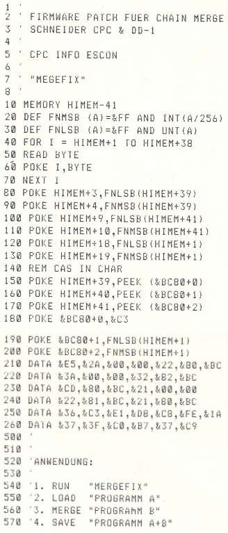 Zahlreiche Anrufe von Lesern machten uns darauf aufmerksam. daß mit dem Floppylaufwerk DDI-1 irgend etwas nicht in Ordnung ist. Die Anrufer beschwerten sich darüber, daß der Befehl Merge nur bedingt funktioniert. Eine Anfrage bei der Firma ESCON ergab, daß tatsächlich ein Fehler in der Hardware des Floppy-betriebssystems vorliegt. Jedesmal, wenn die Merge-Routine beim Laden auf bestimmte Codes stößt, werden diese als Dateiende erkannt. Der Computer meldet sich mit EOF MET zurück. Da die Länge der geladenen Daten jedoch nicht mit der Headersumme übereinstimmt. wird ein Ladefehler ausgegeben. Um die Befehle MERGE und CHAIN voll mit der DDI-1 nutzen zu können, bedarf es einer kleinen Änderung des DISK OPERATING SYSTEMS (DOS). Wir veröffentlichen dieses Programm mit freundlichem Einverständis der Firma ESCON. CPCAI 8506