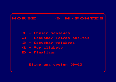 Este programa tiene una serie de opciones, que nos ayudarán a familiarizarnos con esta popular forma de comunicación. En pantalla aparecerá un menú presentando dichas opciones. Has de seleccionar la que desees pulsando el número correspondiente. Una vez hecho esto, y si es necesario, se te preguntará la velocidad de transmisión, que está relacionada con la longitud y separación de los puntos y rayas. Cuanto más grande es esta velocidad, más lenta es la transmisión y más fácil, por tanto, es aprender. La primera opción que puedes elegir es la de emitir mensajes. En esta opción podrás emitir un texto cualquiera, y cuando pulses la tecla «RETURN», «ENTER» o «INTRO» el Ams-trad empezará a emitir el mensaje. La segunda opción es la de escuchar letras sueltas en Código Morse, verás que en pantalla aparece la letra emitida, a la vez que puedes oírla por el altavoz a la velocidad seleccionada. Puedes mantener una letra en pantalla si pulsas la tecla «RETURN», «ENTER» o «INTRO». Para acabar pulsa la barra espaciadora. La tercera opción es la de escuchar en Código Morse una serie de letras (que forman palabras). Tu objetivo es adivinar estas palabras. Es mejor elegir una velocidad lenta, si aún eres principiante en la materia. La cuarta y última opción es la de ver el alfabeto y el correspondiente equivalente en Morse.
