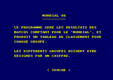 Ce programme vous aide à gérer les résultats du MUNDIAL (éliminatoires compris). Il vous permet d'entrer les résultats de chaque rencontre dès qu'ils sont connus et d'éditer le tableau de classement par groupes. Le fonctionnement de ce programme est très simple. Il est nécessaire, toutefois, de préciser deux points essentiels :