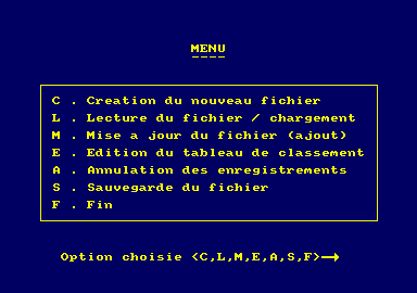 OPTION CREATION (lignes 470 à 960) Comme il a été précisé, avec ce programme, vous ne pouvez créer que des fichiers de 8 groupes à 7 équipes au maximum. En dehors de ces limites, renvoi au menu. L'intitulé des rencontres (14 caractères) est facultatif, il permet de vous retrouver si vous avez plusieurs fichiers à gérer qui peuvent être soit les résultats des matchs éliminatoires Europe ou d'autres continents, soit le premier tour de la compétition finale... et, pourquoi pas, les résultats d'EURO 88 ! Par "matchs simples", il faut comprendre qu'il s'agit des matchs où les deux équipes ne se rencontrent qu'une seule fois. Il est indispensable de préciser le type de rencontre afin de permettre au programme de calculer le nombre de rencontres par groupe et par équipe (710-750). OPTION LECTURE (Lignes 1000 à 1180) Lorsque le fichier devient conséquent (résultats éliminatoires - 3 blocs), le CPC marque une pause après chaque bloc afin de réorganiser sa RAM. Le chargement n'est effectivement terminé qu'a l'affichage du message "Patience..." avant le retour automatique au menu. Moralité (pour les utilisateurs de magnéto-cassettes) : Ne vous précipitez pas sur la touche "STOP EJECT" avant l'apparition du message "Patience..." en bas de l'écran. OPTION MISE A JOUR (Lignes 1220 à 2210) Cette option permet d'ajouter les résultats des rencontres au fur et à mesure qu'ils sont connus. Elle permet également d'effectuer des modifications (après retour au menu, sinon la sous-option E fera l'affaire) de résultats, après avoir pris soin d'annuler la ou les rencontres concernées. La sous-option S permet de continuer la saisie des résultats du même groupe, alors que G fait passer à un autre groupe. A la fin d'une saisie, si vous êtes emballé par l'ardeur sportive et vous appuyez encore sur S : PROBLEME ! Le programme vous demande de rentrer les nouveaux résultats, alors que vous avez terminé la saisie des résultats connus du groupe. Rassurez-vous, vous pouvez vous en sortir de deux façons :