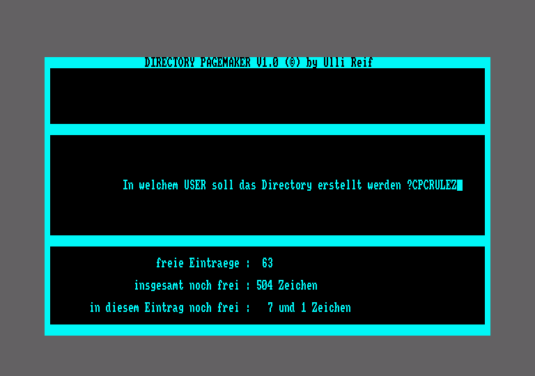 Der Trick: Will man sich über dieses System hinwegsetzen, so muß man zu einem Trick, nämlich zu den Steuerzeichen, greifen: Vor jedes Textstück, die ja alphabetisch sortiert werden, einen LOCATE- Befehl setzen, damit die tatsächliche Darstellungsfolge gleich ist. Durch den LOCATE- Befehl gehen natürlich bei jedem Directory-Eintrag von elf (acht und drei) drei Zeichen (Steuerzeichen für LOCATE, x-,y-Koordinate) verloren. Doch es kommt noch schlimmer: CAT gibt nach dem achten Zeichen des Namens einen Punkt aus, der die drei Zeichen der Extension abtrennt. Um diesen Störenfried zu entfernen, wird der Cursor nach dem Punkt ein Zeichen zurückgesetzt (CHR$(8)), damit ersterer einfach überschrieben wird. Somit ist auch das neunte Zeichen vergeben und übrig bleiben sieben. Richtig! CAT teilt einem ja auch die Länge einer Datei in kByte mit. Diese Mitteilungen zu überschreiben, wäre zu kompliziert. Man muß also deren Darstellung verhindern: CHR$(21) schaltet den Bildschirm ab, CHR$(6) wieder an. Das letzte Zeichen eines jeweiligen Eintrags schaltet den Bildschirm ab, das erste des nächsten schaltet ihn wieder an. Es bleiben also noch fünf Zeichen, die genutzt werden können. Nun kommt noch der Luxus, der auch nicht vergebens ist! Will man nämlich verschiedene PEN-Farben benutzten, so reicht eine einmalige PEN-Anweisung nicht aus, denn Silben vorhergehender Wörter, die aufgrund der alphabetischen Sortierung genausogut erst viel später ausgegeben werden können, würden sonst ebenfalls mit der neuen PEN-Farbe dargestellt werden. Bei dem Silbensalat, der beim Pagen entsteht, wäre das Ergebnis sicher zu bunt! Man kann demzufolge nicht umhin, das PEN-Kom-mando in jeden Directory-Eintrag unterzubringen. Fünf minus zwei macht drei! Von den ursprünglich elf Zeichen verbleiben drei, die für den tatsächlichen Text zur Verfügung stehen. Aus diesem Grunde werden Sie auf einer Diskette nicht 16 oder mehr komplette Bildschirmseiten unterbringen, ebensowenig wie auch nur eine Seite auf einer Diskette, die nur noch zirka zehn von den 64 Einträgen frei hat. Das Programm Das Programm generiert zuerst ein kurzes Maschinenspracheprogramm. das für das Lesen und Schreiben von Sektoren zuständig ist (siehe Tabelle 1). Nach dem Bildaufbau wird die zu bearbeitende Diskette in Laufwerk A: angefordert, ihre Formatierung festgestellt und die vier Sektoren, die das Directory enthalten, werden in den Speicher ab Adresse &9000 geladen. Nun sucht das Programm freie Directory-Einträge und fragt nach der Usernummer, die den erstellten Einträgen vorangestellt werden soll (0 bis 255). Bei den nun folgenden Parameterabfragen sind optionale mit einer vorherigen J/N-Frage versehen. Wollen Sie den betreffenden Parameter nicht verändern, so drücken Sie "N". Die erwarteten Parameter sind jeweils angegeben. Bei Farbfunktionen. die zwei INK-Farben erlauben, ist die zweite (in eckigen Klammern) optional, das heißt, sie muß nicht angeben werden. Zwischen den einzelnen Parametern ist ein Leerzeichen und kein Komma zu setzen. Bitte beachten Sie beim LOCATE-Kommando, daß die Spaltenanzahl vom gewählten MODE abhängig ist. Im unteren Fenster werden die momentan freien Plätze angezeigt. Während der Texteingabe läuft nur die Anzeige für freie Zeichen zur Kontrolle mit.