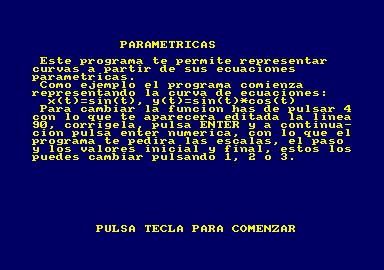 Este programa te permite representar curvas a partir de sus ecuaciones parametricas. Como ejemplo el programa comienza representando la curva de ecuaciones: x(t)=sin(t), y(t)=sin(t)*cos(t) Para cambiar la funcion has de pulsar 4 con lo que te aparecera editada la linea 90, corrigela, pulsa ENTER y a continuacion pulsa enter numerica, con lo que el programa te pedira las escalas, el paso y los valores inicial y final, estos los puedes cambiar pulsando 1, 2 o 3.