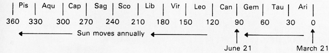 It is from this point, now actually in the constellation of Aquarius (that's why we live in the "Age of Aquarius' ), that the position of ALL celestial bodies is measured. The Sun's position over the whole year is therefore quite simply how many degrees to the left of Aries 0. Consider Figure I where its path has been split into the familiar 12 zones of the Zodiac, each zone equal to 30 degrees. An important point to appreciate is that the Sun appears to rise in the east and set in the west because of the earth's rotation but also appears to move from west to east against the stars, (or Zodiac), because the earth is revolving around the Sun. This west to east movement is. on the whole, true for all the planets and can be seen in real time when the Moon eclipses the Sun, another planet or a star. By and large the planets tend also to travel along the ecliptic. Therefore we can simply define their positions as just a longitude (how far to the left of the first point of Aries).