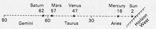 But why are they in this particular order? Well, it was defined by the Romans over 2000 years ago. They believed that the faster a planet appeared to move the nearer it was. This was a very sensible belief because the moon, the fastest mover, could eclipse all the others. Their order of distance was therefore as shown in Table I. Still not the right order? This is because the Romans named each day, beginning with Saturday, after the first hour of that day. That is. if you share out all twenty four hours in a day between the seven days of the week, the day the next hour - that is the first hour of a new day - lands on is the next day in our sequence. (It's a sort of MODULO 7 division.) If you count through the planets in 24s, noting where a 1 falls, you'll get the familiar sequence. Now it is a great pity that humans are slightly short sighted because it is just possible to see the next planet beyond Saturn if you know where to look. However the main reason for missing Uranus is because it travels so slowly. Nevertheless 8 planets plus 8 fingers and 2 thumbs would have ensured binary and octal counting long before computers appeared. In order to locate and identify a planet we need a reference point, and the most convenient is obtained from the most obvious, namely the Sun. This star follows the same path through the "fixed” star background almost once a year. This path is called the ecliptic and the position of the Sun at the spring equinox - on or about March 21 when day and night are of equal length - is called the First Point of Aries.