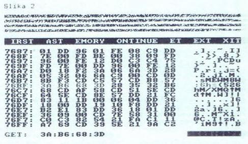 Ker je 32 XX YY koda za shranjevanje vsebine registra A na lokacijo YYXX v pomnilniku, sklepamo, da se register A (napolnjen z vrednostjo 5) shranjuje na lokacije &68B8, &5FEE in &5FEF. V nadaljnjem postopku je treba raziskati vsa mesta, na katerih so ti naslovi, in pogledati, ali se vrednost mogoče kje zmanjša za 1 (izguba življenja). V našem primeru bomo navedli niz 3A B6 68 3D (3A B6 68 je koda za »napolni register A z vrednostjo, ki je v pomnilniški lokaciji &68B6«. 3D pa je koda za »zmanjšaj A za 1«. Iščemo torej, ali se kje vrednost na pomnilniški lokaciji &68B6 zmanjšuje za 1. Ko z GET navedemo ta niz. bomo ugotovili, da se to dogaja na samo enem mestu v programu, na naslovu &76BF (glej sliko 2). Ker predvidevamo, da gre za mesto, na Katerem se v igri zmanjšuje število življenj, bomo tam vpisali instrukcijo 3D (to je naslov &76C2), z E-Y izstopili v basic, s POKE vnesli na ta naslov &B7 (to je instrukcija OR A, s katero se vrednost v registru A ne spreminja, kar je tudi naša želja). Nato je treba pognati igro in pogledati, ali se število življenj zmanjšuje. Potem ko vtipkamo POKE &76C2,&B7: MODE 0: CALL &1E98 in v tej igri izgubimo nekaj življenj, bomo opazili, da se njihovo število ne zmanjšuje oz, da ie še vedno 5. Torej smo našli pravi POKE. Zdaj lahko spet naložimo igro. vtipkamo POKE in shranimo popokano verzijo na disketo ali kaseto za poznejšo uporabo. Moj Micro