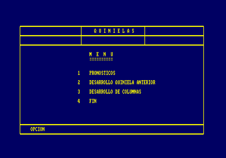 Programa de utilidad para la confección de quinielas futbolísticas que permite disminuir el número de columnas del desarrollo de una combinación mediante la aplicación de reducciones y condicionantes. Las columnas resultantes de este proceso pueden ser almacenadas para su posterior verificación, listado o escrutinio.