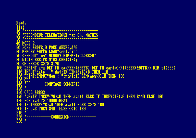 Celui-ci sera réalisé sur une plaque d'époxy et tracé avec des pastilles transfert genre mécanorma ou par procédé photo. Commencez par implanter les résistances puis les condensateurs, les semi-conducteurs et enfin câbler les prises joystick et téléphonique. Il faudra faire attention à l'orientation des composants RED, C3, 0 et Z.C1 : 1 uf 100 volts polyester C2 : 220 nf 63 volts polyester C3 : 1,5 uf 25 volts chimique R1 : 15000 ohms (marron, vert, orange) R2 : 33000 ohms (orange, orange, orange) R3 : 100 ohms (marron, noir, marron) RED : pont de diodes 0 : opto-coupleur Z : diode zener 6V 400 mW divers : un connecteur 9 broches (port joystick) ; une prise téléphonique mâle ou gigognePassons maintenant aux logiciels : Il faudra tout d'abord créer le programme Ser1.bin en langage machine qui sera généré par le programme "CHARGEUR". Il est à noter que j'ai repris la routine de Eddy DUTERTRE parue dans CPC n° 14 (article AMSTRAD et MINITEL). Ensuite, il faudra ini-tialiser les fichiers "message" et "annonce". Pour cela, entrez en mode direct : com = 1 :openout"totmes" : write # 9,com:closeout coa = 1 :openout"totann":write # 9,coa:closeoutIl ne restera plus qu'à taper le programme principal et le programme de sortie sur imprimante. On peut se demander pourquoi séparer ces deux logiciels. Voici l'explication : le port imprimante étant occupé par notre câble de liaison minitel, il va falloir le retirer pour connecter l'imprimante et, pour ne pas risquer d'endommager le CPC, il vaudra mieux arrêter celui-ci. Dans le programme principal, en ligne 870, vous pourrez remplacer "GERARDMER" par le nom de votre ville à condition que celui-ci ne dépasse pas 1 8 caractères et en ligne 890 changer le numéro de téléphone.Utilisation du répondeur : Mettre en marche le CPC, le minitel et brancher l'interface de détection de sonnerie. Après avoir lancé le programme, celui-ci vous demande la date. Il faudra la rentrer sous la forme jj.mm.aa. Ensuite, il vous demandera votre nom : ce nom servira de mot de passe quand vous voudrez interroger le fichier messages à partir d'un minitel. Après avoir entré ce nom, le répondeur se mettra en veille. A ce stade, si vous appuyez sur la touche ENTER, vous serez en pré- sence d'un menu qui vous proposera trois options vous permettant de sortir du programme, d'éditer un fichier ou de retourner en veille. A vous de choisir. Quand vous serez à l'extérieur de chez vous, vous pourrez interroger le répon deur à partir d'un minitel. Si vous voulez interroger le fichier (messages), il faudra appuyer sur 4 et à la question votre nom et envoi, entrez le mot de passe ci-dessus mentionné. Les fichiers "totmes."et "totann.” sont limités à 16 messages ou annonces pour avoir un chargement rapide en mémoire. Imaginons que quelqu'un appelle votre répondeur et y laisse un message. Après la demande de confirmation, son message sera sauvegardé sous le nom de "mes.". Quand cette personne se sera déconnectée de votre répondeur, l'ordinateur ouvrira le fichier "totmes." et chargera la mémoire avec le contenu dudit fichier. Ensuite, il ira ouvrir le fichier "mes.". Si le fichier "totmes." est plein, l'ordinateur effacera le plus vieux message, décalera tous les messages vers le bas et enregistrera le message le plus récent à la fin du fichier "totmes.". Si vous possédez "ODDJOB", vous pourrez accélérer les accès au disk avec la routine "SPEEDISC". Il faudra donc faire run "SPEEDISC" avant de lancer le programme principal. Essai du répondeur en local : Il vous faut deux minitels (empruntez celui d'un copain) et deux prises téléphoniques (disponibles dans n'importe quel supermarché). Réalisez le montage de la figure 4, branchez les deux minitels et lancez le programme principal. Entrez la date puis le nom de code ; le répondeur est en veille. Tapez "ENTER” puis S pour sortir et enfin "GOTO 86”. A cet instant, le minitel connecté au CPC entre en connection. Tapez "CONNEXION/FIN” sur le deuxième minitel ; la liaison est établie, vous pouvez vérifier le bon fonctionnement de votre répondeur. Voilà, j'espère avoir été assez explicite et que vous serez nombreux à vous lancer dans la réalisation de ce répondeur économique. Si vous désirez me poser des questions ou si la réalisation de l'interface vous pose des problèmes, vous pouvez m'appeler sur mon répondeur télématique au 29 60 00 10 et me laisser un message. Je vous répondrai dans la rubrique annonce. Mais respectez les horaires : du lundi au vendredi, de 8h30 à 11h30 et de 14h à 16h30. Merci. BONNE BIDOUILLE !