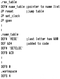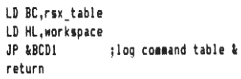 The operating system must be informed of the presence of any RSXs by loading the BC registers with the address of the RSX table, the HL registers with the address of the workspace and calling KL LOG EXT which is at &BCD1. The first nine bytes of the code in Program I are: