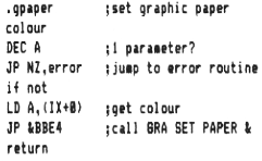 This is located at &8000, so CALL &8000 enables the RSX command table. A word of warning though. RSX tables are linked so that more than one can be active at the same time. Be careful not to enable the same table twice. If you do, then the second time it is linked to the first but as they both occupy the same place the operating system gets in a terrible muddle when looking for a command. The simplest command in Program I is |GRAPER,colour which can be used to set the graphic paper colour. This is a typical example of a simple RSX command: