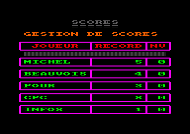 Nouveau jeu : on vous montre d'abord le tableau d'exemple de scores. Après appui sur une touche, vous saisissez les paramètres (en cas d'erreur BIP, et réaffichage !...). A la fin de la saisie, retour au tableau d'affichage avec vos données en bonne place. Après quelques secondes (minutes, heures) d'admiration devant votre score, l'appui sur une touche vous amène à l'écran de sauvegarde. Celui-ci confirme à Momo que c'est bien vous qui venez d'entrer ce score qui lui fait si mal et vous demande un nom pour enregistrer cet exploit. Choisissez un nom rappelant le jeu en question. L'extension "SCO" s'y ajoutera et figurera ainsi au catalogue. Regroupez tous vos scores de jeu sur la même disquette. Jeu déjà enregistré : ici on commence d'abord par vous fournir le catalogue des fichiers.SCO. Momo qui a pris sa revanche s'empresse d'inscrire le jeu dans lequel il vient de briller à son tour. L'écran d'affichage vous rappelle les scores en cours, puis à nouveau, l'écran de saisie mais cette fois le nom du jeu est déjà en place. Momo grave son nom sur es pixels puis le tableau revient lui montrer qu'à ce jeu là, il est le N.B: Sauf adaptation vous ne pourrez grimper à plus de 999.999 points et pas plus haut qu'au 99ème niveau! Vous vous êtes bien sûr aperçu que tous les jeux et pas seulement informatiques pouvaient être «scores» de la sorte. Pensez au SCRABBLE etc.. Michel BEAUVOIS, CPCINFOS n°53