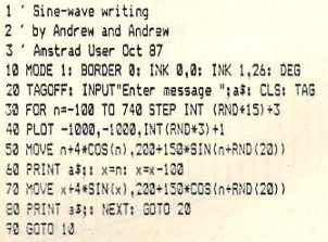 Andrew Perry and Andrew Crawford have clubbed together to produce an interesting listing that move a message across the screen in the form of a sine-wave. The program asks you to input the message you wish moved around the screen. Best results are obtained by using short sentences or a single word.