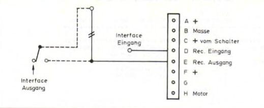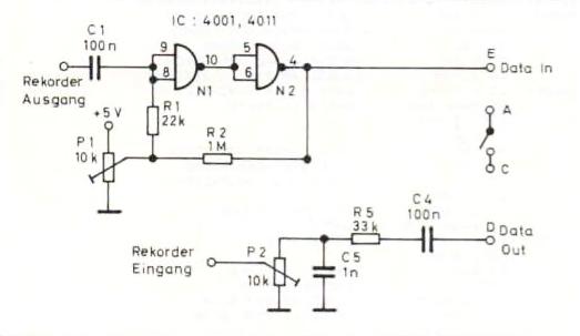 Es soll hier allerdings keine komplette Einbau-Anweisung gegeben werden. Vielmehr bleibt es der Phantasie und dem Geschick des Lesers überlassen, wo er das Interface unterbringen will. Eine gar nicht so schlechte (Bastel-)Lösung ist: das CMOS-IC 'huckepack' über den 7400 (über der Steckleiste) an Pin 7 und Pin 14 einlöten, die anderen Beinchen abbiegen und gemäß Schaltplan mit den Widerständen und Kondensatoren frei verdrahten. Dann kann man die Steckverbindung zum internen Recorder bestehen lassen und muß lediglich den Recorderausgang, Anschluß E (Pin 5 von oben) auf das Interface umschalten. Zu diesem Zweck trennt man die Leiterbahn, die auf der Oberseite rechtwinklig von dem Anschluß zu einer Durchkontaktierung führt, in der Mitte durch und schließt einen Umschalter entsprechend der Skizze (Bild 2) an. Man kann es sich aussuchen, ob man Schalter und die Buchsen für den Recorder-Anschluß hinten an die Ober- oder Unterseite des Gehäuses anbringt.