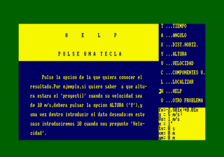 Con este programa podrá obtener cómodamente, todas las soluciones a las cuestiones que se plantee y podrá visualizarlo, para mayor comprensión, en la representación gráfica que acompañará a cada pregunta. El programa comienza preguntándole los datos necesarios para plantear el problema, y cuando los tenga (generalmente vale con dos datos), pasará a resolver el problema sin plantearle más preguntas. Por ejemplo, si quiere saber qué ángulo tendrá un proyectil con la horizontal, cuando su velocidad sea de X m/seg., deberá pulsar la opción «a» (ángulo) e introducir el dato numérico (x), seguido de < ENTER > cuando se le pregunte velocidad. Para pasar a la siguiente opción, dentro de cada cuestión pulsar < ENTER > y se pasará al siguiente apartado DENTRO DE ESA MISMA OPCION. Para volver al menú principal, no hay más que pulsar < ENTER > al llegar al último apartado de cada opción. Vamos a comprenderlo mejor con un caso práctico: Quiere saber la altura a la que estará el proyectil cuando lleve cinco segundos, diez segundos, y veinte segundos de vuelo. Deberá hacer lo siguiente: