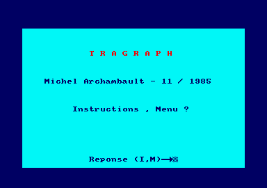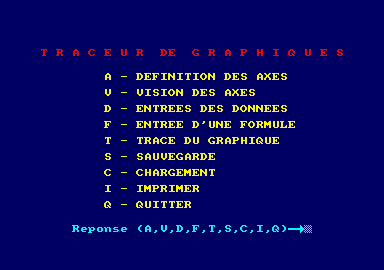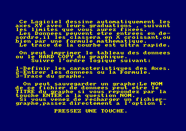 Ceux d'entre vous qui ont fente de faire une représentation Graphique d'un ensemble de données et ont connu les affres des paramétrages X,Y , des graduations d'axes et des décalages en tous genres. Finis, ces casse-têtes !Ce logiciel se charge de tout. Il trace les axes, les graduations, leurs valeurs, les légendes, les unités, le titre et bien sûr la courbe en haute résolution ; à l'écran et si vous le désirez sur imprimante. A partir de quoi ? Au choix : des données entrées en désordre, ou bien une formule mathématique même ultra complexe ! Ajoutons à cela les options sauvegarde/chargement, l'accès aux coordonnées polaires, les modifications d'axes et les sécurités pour étourdis. Un rêve tout cela ? Non, mais 9000 octets à taper... Ce n'est pas un gadget, c'est un vrai utilitaire.
