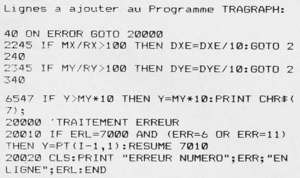 L'ESPRIT Pour se "promener" dans ce logiciel, il suffit d'avoir toujours en tête la chose suivante : Le tableau des données à représenter sous forme de courbe est totalement indépendant de l'ensemble des paramètres de tracés (limites d'axes, légendes, etc.). Autrement dit, on peut conserver nos axes pour d'autres données, ou changer les axes pour ces mêmes données. Souplesse totale et "bidouilles" sans limites... C'est le sous-programme TRACE qui assemble ces deux domaines. Il peut enchaîner sur un 'HARD COPY" d'écran sur imprimante (utilisant les codes standard EPSON). LE LISTING Rassurez-vous, il n'est pas obligatoire de tout retaper. Vous pouvez vous dispenser du module "Instructions" (1500) et, si vous n'avez pas d'imprimante, des modules 11000 et 58000. La définition des axes On vous demande d'entrer les limites mini et maxi pour les axes "X" (horizontal) et "Y" (vertical) du graphique. Deux impératifs : – il faut que ces valeurs ainsi que leurs différences (dX, dY) soient des nombres entiers ( = non décimaux) avec au maximum deux chiffres "significatifs". Exemples : 0, 1, 23, 460, -65000. Sont interdites des valeurs telles que 2.5, 115, 2050 ou 0.5. Le risque serait d'être piégé par la différence. Exemple : mini = 25, maxi = 140, mais la différence est 115 : le programme vous le signale, et vous renvoie au départ. On demande également (facultatifs) un titre, légendes et unités d'axes ; ils apparaîtront sur le graphe. Puis, le programme établit ses coefficients de traçage (lignes 2200 à 2600). Voir la liste des variables. Le tracé des axes C'est très complexe, mais rapide. Le logiciel trace les axes X et Y, puis, à l'aide des coefficients précédents, il détermine (en MODE 2) quelles vont être les graduations les plus rationnelles, aux pas de 1, de 2, de 10. Il trace les petits traits de graduations, avec des tailles différentes pour les valeurs en '5" ou en "0", comme sur un double décimètre. Il écrit au-dessous (X) ou à gauche (Y) leurs valeurs bien centrées en face du trait. Pour la clarté de lecture, il n'écrit que les deux premiers chiffres, sauf trois pour le nombre " 100". Ainsi, une échelle de 63000 à 78000 sera "numérotée" de "63" à "78" ; mais les limites réelles( 63000-78000) seront rappelées à côté. En revanche, une échelle de -3 à +10 sera effectivement numérotée de -3 à + 10. Tous les "cas de figures" ont été envisagés afin de fournir des graduations claires et lisibles (ce fut d'ailleurs un sacré casse-tête). L'entrée des données (lignes 5000 à 5400) C'est un écran de saisie à trois colonnes, le numéro (affichage automatique), valeur X, valeur Y. En fin de saisie, entrez en X la lettre "Q". Le nombre maxi de points a été fixé à 102. Vient ensuite le tri de ces données en valeurs croissantes de X. Vous venez de remplir le tableau DIM PT( 102,1) (PT venant de L'entrée de formules Un luxe que peu de micro-ordinateurs autres que l'AMSTRAD peuvent se permettre ! Une curiosité du CPC est que l'on peut l'arrêter (par END ou ESC), modifier ou ajouter une ligne de programme, et repartir par un GOTO sans prendre les variables en RAM (essayez donc cela sur un autre... ). On stoppe par un END (6080) et on vous invite à entrer la ligne 7000 contenant votre formule. Ceci fait, tapez ENTER, puis le point décimal du pavé numérique, Le tracé Très court puisqu'il reprend le tracé des axes en enchaînant sur des DRAW de "point en point". Durée moyenne une seconde et demi... LEGENDE DES VARIABLES Quand on l'a assez vu, on appuyé sur une touche quelconque pour revenir au menu. Sauvegarde et chargement (lignes 9000 à 10500) Ces modules sont conçus pour cassette et disquette, donçw le nom du fichier est obligatoire. A la sauvegarde, si vous répondez par ENTER, le nom est constitué par les huit premiers caractères du titre TIT$. L'extension ".GRA" est ajoutée par le programme. Impression Deux variantes : la liste des données (pour toutes imprimantes) ou le Hard Copy d'écran. Celui-ci utilise la fonction TEST ; son tracé est très fin, mais il est long, environ neuf minutes. L'UTILISATION PRATIQUE Rappelez-vous l'issue de secours : touche ESC puis GOTO 1000 ( = menu), facile à retenir... Le côté amusant est l'utilisation de l'option F (formule). Nous avons choisi trois exemples "parlants". 1 – Hyperbole : option A (axes, définissez X et Y de 1 à 10. Retour menu – option F. Tapez : 7000 Y=10/X. 2 – Sinusoïde : option A, définissez X de 0 à 360 (degrés) et Y de -1 à 1, puis option F. 7000 DEG:Y = SIN(X) 3 – Cercle. Ça se complique un peu... Option A = idem que précédemment. Option F, entrez : 7000 DEG:Y = SIN(X):Z = COS(X) Puis retour menu (option N). Le tableau DIM est correctement rempli, mais l'axe des X (de 0 à 360) ne convient plus du tout ! Donc, de nouveau option A : X et Y, tous deux de -1 à +1. Menu, option T. Mais, c'est une ellipse ! Oui, car les échelles n'ont pas le même "étirement". Remédions à cela : retour menu, encore option A : X de -1 à 2 et Y de -1 à 1. Menu, option T : oh, le beau cercle ! Résumons la manœuvre : X (de 0 à 360°) a servi à faire 101 calculs de Y, mais c'est Z = COS(X) qui est logé dans le tableau DIM. Lorsqu'en option A, on définit les limites de l'axe X, ce sont ses limites pour le calcul ; libre à nous, une fois le tableau rempli, de modifier les limites de X (ou de Y... ). CONCLUSION La sortie instantanée de graphiques va séduire beaucoup d'entre vous, mais je sens que nos amis matheux vont "sortir" autre chose que cercles ou spirales avec des lignes 7000 longues, longues... Envoyez-les nous ! CPC n°6