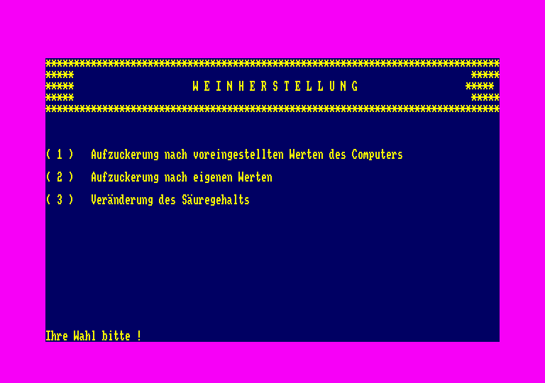Das Programm besitzt den deutschen Zeichensatz. Die Tastaturbelegung ist folgendermaßen: ü=@ ä=; ö=: ß=^ +=] *=[ y und z sind vertauscht. Das Programm dient zur Einstellung bzw. Verbesserung der gewünschten Anfangswerte bei der Weinzubereitung. Es sind vier verschiedene Berechnungen möglich: Zum ersten kann die Zuckermenge berechnet werden, die dem Most zugegeben werden muß, um bestimmte Ausgangs werte zu erhalten. Es sind sieben Werte im Programm vorgegeben: - Apfel-, Birnen-, Obstwein
