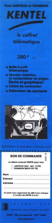 L'administration FRANÇAISe des Télécommunications nous a fait un beau cadeau (une fois n'est pas coutume), en créant en France l'un des réseaux télématiques les plus populaires du monde* Ce réseau, bien qu'encore d'un coût horaire particulièrement élevé sur certains services, offre des services d'une qualité assez bonne. Mais point n'est ici besoin de vanter les qualités de nos P & T. Par contre, ce que n'avaient peut être pas prévu nos postes monopolisantes, c'est que l'installation chez des particuliers de terminaux gratuits, susciterait chez certains d'entre eux une passion pour la télématique insoupçonnée, et conduirait à la réalisation de produits télématiques d'une qualité rare. En effet, mettez sur le bureau d'un bidouilleur informatique un Minitel et un microordinateur, et il ne tardera pas à se rendre compte que relier les deux peut donner des résultats intéressants : d'un côté un ordinateur (dans le cadre de ce journal, seul l'Amstrad en particulier le CPC, nous intéressera) pouvant exécuter des programmes et donc fonctionner intelligemment, et de l'autre un Minitel qui contient un modem relativement performant, qui plus est, accessible de l'extérieur grâce à la prise périminitel ainsi qu'un émulateur vidéotext tout prêt. Les premières réalisations mettant en pratique la théorie de la rencontre Minitel/ordinateur, celle de Loriciels avec Loritel par exemple, consistaient à rendre, à l'aide du CPC, le Minitel intelligent, c'est-à-dire pouvant stocker des images écran, établir des chemins d'accès vers des serveurs, ou des masques de saisie pour l'annuaire télématique. Jusqu'à présent quelques tentatives avaient été effectuées pour aller encore plus loin, et transformer le couple CPC/Minitel en serveur, mais sans grand succès, ou avec des résultats assez éloignés des exigences des apprentis-opérateurs télématiques. Aujourd'hui, le coffret téiématique Kentel arrive, et est une approche économique (ia plus économique qui soit) de la constitution de micro-serveurs sur Amstrad CPC, avec en plus une souplesse d'utilisation, liée à une grande puissance de fonctionnement, assez étonnante. Néanmoins, ici intervient ia première critique, qui n'esî pas non plus la plus négligeable : le coffrer télématique Kentel n'est en fait qu'un kit serveur puissant, et ne propose aucune fonction dédiée à l'utilisation du Minitel sous la forme de terminal intelligent Inutile de chercher ici une touche pour copier les pages du Minitel sur disquette, ou pour saisir des données sur le 1 i (annuaire électronique), il n'y en a pas (et pourtant nous avons cherché). Toutefois la boite à outils, dont nous reparierons plus loin, doil permetrre de mettre en œuvre, soi-même, des programmes de ce type, mais il ne faut pas être rebuté par la programmation. Les différentes composantes du kit Le kit Kentel est compose d'une cassette transférable sur disquette, et d'un câble accompagné d'un circuit imprimé, d'un manuel assez complet de vingt-cinq pages, d'une carte de montage pour le CPC, et c'est tout. Pour mettre en œuvre le serveur, il vous faudra trouver en plus un Minitel retournable (identifiable par le R qui est marqué sur la plaque d'identification située sous le boîtier), ainsi qu'une pile électrique de 4.5 V et une ligne téléphonique (n'oubliez surtout pas ia ligne téléphonique !). L'installation du 'HARD' (trois fils, une pile et un circuit imprimé, de deux centimètres carrés.) ne fïose aucun problème et s'effectue en quelques minutes. D'un côté le câble connecté sur la sortie parallèle de l'imprimante du CPC, de l'autre sur la prise périminitel du Minitel, une micro-ventouse à poser sur l'un des côtés du poste téléphonique, et deux fils à brancher sur l'alimentation constituée par la pile plate de .4,5 V et c'est tout, le tout très bien expliqué dans le complément du manuel.