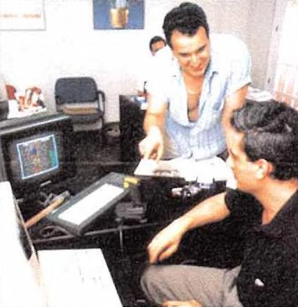 José Antonio Morales programador y Carlos Díaz co-autor de los gráficos junto a Gonzalo Suárez han trabajado durante meses para llevar a Mot a la pantalla. (1989)