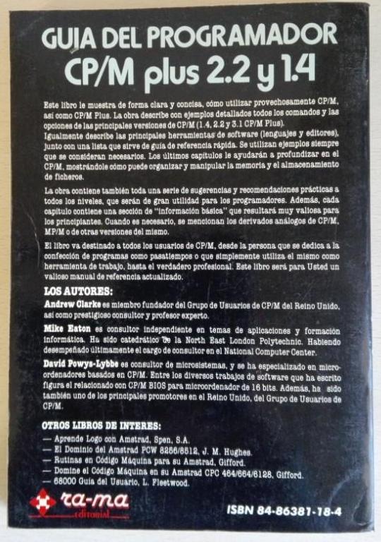 Este libro de la editorial Ra-ma, nos muestra de una forma clara y concisa como utilizar del modo más provechoso el CP/M, así como CP/ M Plus.Los principiantes en CP/M no tendrán problemas ya que el libro ha sido concebido para diversos niveles de preparación, encontrándose en los párrafos iniciales de cada capítulo una sección llamada" fundamentos" con la que se obtiene una visión general, para empezar. Y terminando con un resumen de referencia acerca de los puntos tratados en ese capítulo, con el que se puede aumentar el bagaje de nuestros conocimientos. Por ello este manual es destinado a todos los usuarios de CP/M, desde la persona que individualmente está interesada en el tema hasta el verdadero profesional. Esta obra no sólo describe con ejemplos detallados todos los co -mandos y las opciones de las principales versiones de CP/M (1.4,2.2 y 3.1 CP/M Plus) sino que describe igualmente las principales herramientas de software (lenguajes y editores), junto con una lista que sirve de guía de referencia rápida. Otro punto a favor del manual es la gran cantidad de ejemplos que se dan en los capítulos que pueden tener una mayor dificultad y la introducción de sugerencias y recomendaciones prácticas a todos los niveles, que serán de gran utilidad para los programadores. Amstrad Acción