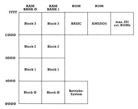Il y a encore 5 ans, les ordinateurs disposant de 16 K de RAM étaient considérés comme bien armés. Mais depuis l'apparition du Commodore 64, les limites de la mémoire ont été nettement repoussées. Un constructeur de micro-ordinateurs n'a de chances suffisantes de prendre une part du marché que si les magiques 64 apparaissent sur sa machine. Mais comme les prix des composants de mémoire ont fortement chuté ces derniers mois, le fait qu'un ordinateur soit doté de 64 K octets (comme le 664) ou de 128 K octets (6128), influe peu sur son prix de revient.D'ailleurs, il n'est pas très difficile de placer une mémoire de 64 K dans un ordinateur puisque les processeurs 8-bits, qui sont les plus répandus, peuvent tous adresser une zone de 64 kilo-octets. Le Z80 du CPC peut lui aussi adresser 64 K de mémoire sans truc particulier. Mais cela suffit normalement tout juste pour la mémoire RAM et c'est tout. Il faut donc recourir à un procédé spécial, le bank-switching, si l'on veut pouvoir adresser plusieurs mémoires avec ce type de processeurs. Ce procédé permet en effet de choisir entre des zones de mémoire (qu'on appelle banques) ROM et RAM qui se chevauchent. Il s'agit d'un procédé qui n'utilise pas de solution matériel mais a uniquement recours à un logiciel qui organise la cohabitation des ROM et des RAM aux mêmes adresses. Cette solution logiciel a été remarquablement mise en œuvre par les développeurs de l'ordinateur. Sur le CPC 6128, l'adressage du bloc supplémentaire de 64 K de RAM est également réalisé grâce à ce procédé. Le CPC 6128 présente donc l'image suivante: (remarque: sur le CPC 664, le principe est le même, si ce n'est que la banque supplémentaire de 64 K fait défaut) 64 K de RAM sont adressés directement. Parallèlement à la RAM se trouvent une moitié de la ROM dans les 16 K inférieurs (&0000 à &3FFF) et l'autre moitié de la ROM dans les 16 K supérieurs (&C000 à &FFFF), ainsi que, sur toute la zone d'adresses, la banque supplémentaire de 64 K de RAM (cette dernière n'est cependant pas adressable aussi directement). Les 16 K inférieurs de ROM contiennent le système d'exploitation et un bloc de routines arithmétiques. Dans le système d'exploitation se trouvent toutes les routines dont le CPC a besoin pour lire par exemple un caractère tapé au clavier, pour placer un caractère ou un point sur l'écran mais c'est également le système d'exploitation qui commande le lecteur de cassette et l'interface imprimante ainsi que le son. Dans les 16 K supérieurs se trouve l'interpréteur Basic. Ces 16 K n'ont pas de fonction spéciale. Il est possible de connecter dans cette zone jusqu'à 252 ROMs supplémentaires. C'est ainsi que les routines nécessaires pour la gestion du lecteur de disquette sont placées dans une ROM qui 'partage' cette zone avec le Basic.  La disposition de la mémoire est représentée par la figure 1.1.1.1