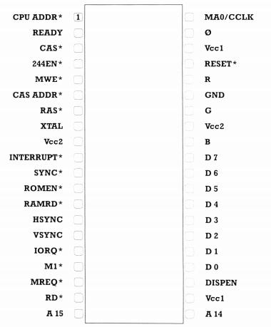 Comme les composants de mémoire ne disposent que de 8 canaux d'adresse, l'adresse totale de 16 bits doit être multiplexée, c'est-à-dire placée sur les entrées avec un décalage dans le temps. Cette commande dans le temps est obtenue avec les signaux CAS ADDR* pin 31 (pin 6), CAS* pin 16 (pin 3) et RAS* pin 34 (pin 7). Ces signaux RAS* et CAS* sont placés directement vers les RAMs, le signal CAS ADDR* est conduit vers les multiplexeurs que nous avons déjà évoqués. Le signal MA0/CCLK sur le pin 4 (pin 40) du gâte array a également une fréquence de 1 MHz. Ce signal est par ailleurs déphasé par rapport au signal CPU ADDR*, c'est-à-dire que les deux fréquences sont high à des moments différents. MA0/CCLK a également une double fonction. Il constitue d'une part le signal d'horloge pour le CRTC qui tire tous les autres signaux de ce signal; d'autre part il est placé comme bit d'adresse auxiliaire sur un des quatre multiplexeurs d'adresse. La fonction de ce bit d'adresse auxiliaire sera également évoquée plus tard plus précisément, à propos de la commande de la RAM Le gâte array produit encore sur le pin 29 (pin 13) le signal RAMRD*. Cette connexion devient low, lorsque le processeur, après avoir fourni une adresse, veut lire des données dans la RAM et qu'il l'indique au gâte array par son signal RD* sur le pin 21 (pin 19). Comme la ROM et la RAM se chevauchent sur de grandes zones, le signal RD* du processeur ne peut être utilisé directement. Si des données doivent être lues dans la ROM le signal RAMRD* reste high et les sorties du DATA LATCH/BUFFER 74LS373 (un buffer est une mémoire provisoire) deviennent high. Dans ces moments, aucune information ne peut passer de la RAM sur le bus de données, bien que l'adresse de la mémoire soit également parvenue à la RAM et que celle-ci tienne un octet prêt dans ses sorties. En plus du RAMRD*, le signal READY du pin 22 (pin 2) du gâte array est placé sur l'IC 74LS373. Ce signal produit sur le processeur le signal pour l'insertion des cycles d'attente. La liaison supplémentaire entre le READY et le LATCH/BUFFER permet d'obtenir que l'information sur le bus de données du processeur ne se modifie pas pendant les cycles d'attente. Le 74LS373 stocke, après envoi d'un high sur le pin 11, l'information en sortie actuelle, jusqu'à ce que ce pôle devienne low. Le circuit intégré se comporte ensuite comme un simple buffer, c'est-à-dire que les sorties suivent immédiatement les modifications des entrées. Le signal ROMEN* sur le pin 27 (pin 12) du gâte array devient low lorsque le processeur veut lire des données dans la ROM. La ROM intégrée de 32 K du CPC occupe les zones d'adresses &0000 à &3FFF et &C000 à &FFFF. Cette ROM peut donc être appelée en deux moitiés distinctes. Dans les zones de mémoire où RAM et ROM se chevauchent, il faut indiquer au gâte array le choix fait avec une instruction OUT. Il est ainsi tout à fait possible de n'activer qu'une moitié de la ROM. Conformément à la configuration de la mémoire choisie, le gâte array décode l'état des canaux d'adresse Al4 et Al5. Suivant la mémoire demandée c'est le signal RAMRD* ou ROMEN* qui sera activé lors de la lecture. Une instruction d'écriture du processeur va toujours vers la RAM indépendamment de la configuration de la mémoire choisie. Le gâte array produit à cet effet le signal MWE*. Outre la fonction décrite, les canaux d'adresse A14 et A15 sur les pins 28 (20) et 30 (21) sont encore utilisés dans un autre but. Le gâte array a une adresse de port qui est utilisée pour programmer les différentes possibilités du gâte array. L'adresse de port est &7F00 et elle est décodée sur le pin 17 (pin 18), à travers les canaux d'adresse (A14 High, Al5 Low) et le signal IORQ*. Comme le bus de données du Z80 n'est pas directement relié aux canaux de données DO à D7 du gâte array, le GA (gâte array) met le pôle 244EN* sur low lorsque l'adresse de port &7F00 est identifiée de la façon que nous avons indiquée. Les sorties du 74LS244, un buffer de bus de données, sont ainsi libérées et l'octet fourni par le Z80 peut être écrit dans le GA. Mais le signal IORQ* a lui aussi une double signification pour le GA. Le Z80 a en effet la particularité, lorsqu'il identifie une interruption, de mettre simultanément à low les signaux IORQ* et Ml*. Cette situation est identifiée par le GA et l'impulsion d'interruption est immédiatement annulée. Si, par contre, le traitement de l'IRQ a été interdit par l'instruction DI, Disable Interrupt, le pôle 10 du GA reste low, jusqu'à ce que l'IRQ soit à nouveau autorisé. Dès que l'IRQ est à nouveau autorisé par l'instruction El, Enable Interrupt, l'interruption présente est identifiée et la sortie d'interruption redevient high. Le signal d'interruption sur le pin 32 (pin 10) est produit par une chaîne de division programmable du GA. Cette chaîne de division est alimentée par le signal HSYNC du CRTC et elle divise la fréquence existante par 52. Comme l'impulsion HSYNC se produit environ toutes les 65 microsecondes, l'intervalle entre deux impulsions d'interruption est de 3,3 millisecondes. Les impulsions sont couplées avec le signal VSYNC du CRTC. La durée du VSYNC est programmée dans le CRTC à environ 500 microsecondes. Après environ 125 microsecondes apparaît l'interruption, de sorte que la routine d'interruption a encore environ 375 microsecondes pour examiner sur le bit 0 du port B du 8255 s'il y a un VSYNC. Ce signal est utilisé comme horloge dans différentes opérations. Ce cas ne se produit cependant que toutes les 15 interruptions, pour les 14 interruptions restantes, il y a un high du VSYNC et le compteur interne n'est pas affecté. Mais les signaux HSYNC et VSYNC sont bien sûr nécessaires, de même que DISPEN pour produire le signal vidéo. Une liaison de ces signaux donne le signal SYNC* sur le pin 5 (pin 11 ) du GA. CPCrulez[Content Management Syste