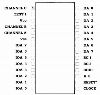 DA0 - 7 : Ces connexions du chip sonore sont reliées au bus de données du processeur. Le nom DA indique que aussi bien des Données que des Adresses (de registre) passent à travers ces connexions. A8 : Cette connexion peut être comprise comme un signal CHIP-SELECT. Pour appeler des registres du PSG, ce signal doit être high. BDIR & BC1,2 : La connexion signal BDIR (Bus DIRection) et les connexions BC1 et BC2 (Bus Control) commandent l'accès aux registres sur le PSG. Au premier abord, l'affectation indiquée par le tableau peut paraître curieuse. Mais comme ce circuit intégré fut à l'origine développé comme composant du processeur 1610, un processeur 16 bits spécial de General Instruments, on a pris en compte lors de la conception les propriétés spéciales et des connexions de commande de ce processeur. BDIR BC2 BC1 Fonction du PSG 0 0 0 INACTIVE 0 0 1 LATCH ADRESS 0 1 0 INACTIVE 0 1 1 READ FROM PSG 1 0 0 LATCH ADRESS 1 0 1 INACTIVE 1 1 0 WRITE TO PSG 1 1 1 LATCH ADRESSDans ce tableau, seules quatre des huit combinaisons ont vraiment un sens. C'est pourquoi la connexion BC2 est souvent mise sur +5 Volts. Le tableau restant n'est donc plus influencé que par les signaux BDIR et BC1 et il se présente ainsi:BDIR BC1 Fonction du PSG 0 0 INACTIF, le bus de données du PSG a une valeur en ohm haute 0 1 READ, des données peuvent être lues dans les registres du PSG 1 0 WRITE, des données peuvent être écrites dans le registre du PSG sélectionné 1 1 LATCH, le numéro ou l'adresse du registre du PSG souhaité est écrit dans le PSGANALOG A C'est la sortie du canal A. Ici peuvent être retirés les sons produits par le canal A. La tension maximale en sortie est d'1 Vss.ANALOG B Fonction identique au pin 1, pour le canal B ANALOG C Fonction identique au pin 1, pour le canal C IOA7 - 0 : Les connexions IOA représentent le port 8 bits du PSG. Suivant la façon dont elles sont programmées, les connexions travaillent comme sortie ou entrée. Mais on ne peut fixer qu'un même mode de travail pour tout le port. On ne peut avoir simultanément des bits travaillant en entrée et d'autres en sortie. CLOCK : De la fréquence de ce signal sont dérivées par division toutes les fréquences de son. La fréquence de ce signal devrait être entre 1 et 2 MHz. RESET : Un niveau low sur cette connexion annule les valeurs de tous les registres. Sans reset, les registres contiennent après la mise sous tension des valeurs aléatoires dont la conséquence serait un bruit probablement très peu musical. TEST1 : Test1 n'est utilisé que par le constructeur et ne doit pas être connecté en travail normal. Vcc : Une tension de +5 Volts est placée sur cette connexion. Vss : Ceci est la connexion de masse du PSG.  1.8.1.1 CHIP SONORE AY-3-8912