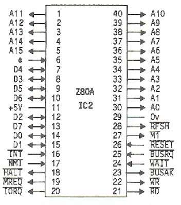 ---------------------------------------------------------- Nom de broche Signification ---------------------------------------------------------- 1 ; Bit d'adresse 11. 2 ; Bit d'adresse 12. 3 ; Bit d'adresse 13. 4 ; Bit d'adresse 14. 5 ; Bit d'adresse 15. 6 ; Horloge. 7 ; Bit de donnée 4. 8 ; Bit de donnée 3. 9 ; Bit de donnée 5. 10 ; Bit de donnée 6. 11 ; Tension de 5 volts régulés. 12 ; Bit de donnée 2. 13 ; Bit de donnée 7. 14 ; Bit de donnée 0. 15 ; Bit de donnée 1. 16 ; Interruptions masquables. 17 Interruptions non masquables. 18 ; Signal d'arrêt du microprocesseur. 19 ; Demande d'opération mémoire. 20 ; Demande d'entrées/sorties. 21 ; Commande de lecture mémoire. 22 ; Commande d'écriture mémoire. 23 ; Acceptation d'accès direct mémoire. 24 ; Demande d'attente au microprocesseur. 25 ; Demande d'accès direct mémoire. 26 ; Initialisation du microprocesseur. 27 ; Signal de début de cycle. 28 ; Rafraîchissement des mémoires dynamiques. 29 ; Tension 0 volt masse électriques. 30 ; Bit d'adresse 0. 31 ; Bit d'adresse 1. 32 ; Bit d'adresse 2. 33 ; Bit d'adresse 3. 34 ; Bit d'adresse 4. 35 ; Bit d'adresse 5. 36 ; Bit d'adresse 6. 37 ; Bit d'adresse 7. 38 ; Bit d'adresse 8. 39 ; Bit d'adresse 9. 40 ; Bit d'adresse 10.