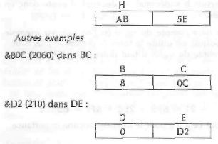 UNT (&FFEB) = - 21 et &EB + 256 * &FF = 65515Mais, répétons-le, tout cela n'a pour le moment aucune importance.Pour en donner une idée claire, on pourrait dire que la programmation en langage machine consiste pour une grande part en une manipulation de différentes "boîtes" dans lesquelles il est possible de mettre des valeurs, et que l'on peut par exemple additionner et soustraire entre elles. Chacune de ces boîtes, que l'on appelle registre, a un nom. Nous nous intéresserons pour l'instant à sept de ces registres : A, B, C, D, E, H et L. Ce sont, en fait, des registres simples mis deux à deux. Nous en utiliserons trois : BC, DE et HL.
