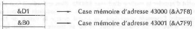 Encore une fois, tout cela est géré par la machine et nous n'aurons pas à nous en préoccuper. L'intérêt est néanmoins évident : comme il existe des instructions permettant de tester les indicateurs, nous pourrons effectuer des branchements conditionnels du genre : "Si l'indicateur 7 est à 1, alors il faut faire ceci ou cela..." C'est en fait exactement comparable à l'instruction IF du BASIC. Remarque Certaines opérations n'entraînent aucune modification des indicateurs, et cela quel que soit le résultat. En outre, certaines instructions conditionnelles ne peuvent s'utiliser qu'en fonction par exemple de l'indicateur 6, et non pas en fonction du 7 (ou vice versa). Le CPC est un ordinateur ayant une RAM (mémoire vive) de 64K, ce qui signifie 64x1 024 = 65 536 octets ou cases mémoire, ayant chacune une adresse de 0 à 65535. Lorsque vous écrivez un programme BASIC, il est codé par la machine et stocké à partir de l'adresse la plus basse (368). Plus le programme s'allonge, plus la mémoire se remplit. En outre, il peut arriver que l'exécution d'un programme nécessite des cases mémoire dans les adresses les plus hautes (43903 et au-dessous). MEMORY 10000les cases mémoire allant de 10001 à 43903 resteront vierges de toute intrusion, et le BASIC restera confiné entre les adresses 368 et 10000. Il ne s'agit là que d'un exemple, et nous n'aurons fort heureusement pas à réserver des zones de mémoire aussi importantes. Un programme en langage machine de 500 octets, par exemple, représente déjà un programme tout à fait considérable. Ceux que nous vous proposerons dans cet ouvrage tournent autour de 100 ou 200 octets. Un MEMORY 43600 serait donc tout à fait suffisant, la perte de mémoire négligeable, et rapidement amortie.Nous utiliserons l'espace mémoire ainsi ménagé de deux manières : d'une part pour y écrire nos instructions, et d'autre part, bien que plus rarement, pour y stocker des données. Il importe dès à présent de bien distinguer l'adresse d'une case mémoire de son contenu. Exemple