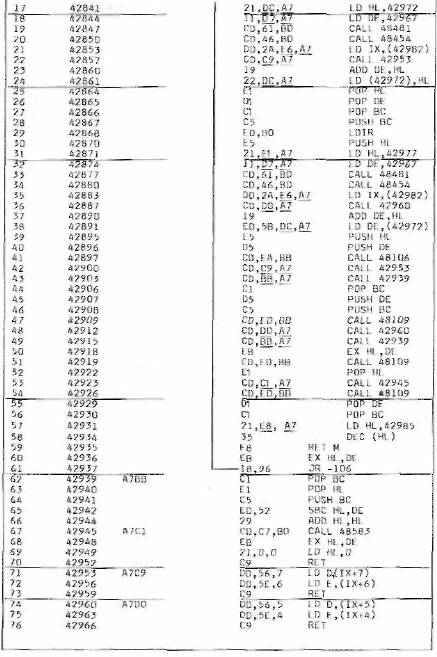 EXEMPLES DE PROGRAMMES6. CERCLE RAPIDE Attention, il est absolument nécessaire d'avoir au préalable étudié le programme précédent avant de passer à celui-ci. Ce programme de cercle rapide est basé sur une idée fort simple : puisque les routines Sinus et Cosinus sont lentes, nous allons nous arranger pour les utiliser le moins possible. Pour ce faire, une solution vient immédiatement à l'esprit : calculer les sinus et cosinus des angles qui nous intéressent une fois pour toutes, et les ranger dans un tableau où nous n'aurons plus qu'à les lire. Ce tableau comprendra 910 octets (de 42985 à 43894), et son remplissage se fera grâce à un petit programme BASIC qu'il suffira de lancer une fois avant le premier appel du programme "Cercle rapide". On pourra ensuite utiliser ce dernier autant de fois que l'on voudra, et la relative longueur d'exécution du remplissage (environ 8,6 secondes) n'est de ce fait pas gênante. Voici le programme BASIC : 10 MEMORY 42984 : DEG : T = 42985 20 FOR I = 90 TO 0 STEP -1 30 A = COS(l) : FOR H = 0 TO 4 : POKE T + H,PEEK(@A + H) :NEXT H : T = T + 5 40 A = SIN(I) : FOR H = 0 TO 4 : POKE T + H,PEEK(@A + H) :NEXT H :T = T + 5 50 NEXT ISi vous avez lu en Annexe V la section concernant les variables numériques, vous devriez le comprendre facilement :La représentation en virgule flottante de COS(90) est stockée sur 5 octets (42985 à 42989), puis celle de SIN(90) sur les cinq suivants (42990 à 42994), puis celle de COS(89) sur les cinq suivants, puis celle de SIN(89), et ainsi de suite jusqu'à 0 compris. En bref, les cosinus et sinus alternent dans le tableau de 5 en 5 octets. La plus grande partie du programme fonctionne exactement de la même manière que le précédent et beaucoup de lignes sont identiques. Elles ne seront plus expliquées autrement que par un renvoi aux lignes ou blocs de lignes identiques du programme précédent. Il ne faut toutefois pas oublier que, ce programme n'ayant pas la même situation en mémoire, les adresses internes (placards et sous-programmes internes) seront différentes. Les placards, par exemple commencent à l'adresse 42967 (&A7D7). Cela n'empêche évidemment pas que les démarches soient identiques. Précisons enfin que toute la première partie (rendant PV optionnel et installant la protection) n'a pas été réécrite. Vous pouvez, bien sûr l'ajouter. Tel qu'il est donc, ce programme ne peut soutenir que quatre paramètres et ne dessine que des cercles vides. Il commence en 42800, finit en 42966, n'est pas directement relogeable, et son format d'appel est le suivant : CALL 42800,XC,YC,R,C Son chiffre de vérification est 26406. Une petite astuce : si vous ne vous sentez pas le courage nécessaire pour ajouter la partie permettant l'option plein / vide, essayez ceci : * Pour un cercle plein, ajoutez, immédiatement avant l'appel du programme, la ligne : POKE 42927,&F9 : POKE 42910, &F9 * Pour un cercle vide, remplacez &F9 par &ED. Ce procédé est, disons-le, assez rudimentaire et plutôt lourd à utiliser, mais il a au moins le mérite d'être simple à mettre en place. Voici le listing de ce sixième programme :