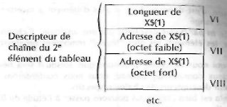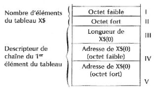 EXEMPLES DE PROGRAMMES8. EXEMPLE 8: TRI DE DONNÉES ALPHANUMÉRIQUES Notre approche du langage machine serait incomplète si elle ne comprenait pas une petite incursion dans le royaume des données alphanumériques. (L'étude préalable de l'Annexe V, section 2, est impéra-tive.) CALL 43830, @X$(0) X$ est le nom du tableau (qui peut être quelconque), et l'ensemble @ X$(0) pointe donc sur l'adresse du descripteur de chaîne de la première donnée du tableau (son rang est 0). Il est indispensable que nous nous arrêtions un moment sur cette notion de tableau et, pour être plus précis, sur l'organisation en mémoire des descripteurs de chaîne des éléments qui le composent. Pour n'importe quel tableau X$ (à une seule dimension), ces descripteurs de chaîne sont stockés de la manière suivante :
