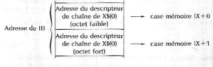 Les chiffres romains indiqués sur la droite ne nous serviront qu'à nommer les emplacements mémoire correspondants lors des explications. Rappelons que l'appel du programme se faisant sous le format : CALL 43830, @X$(0) Le registre IX sera pointé comme suit :