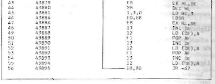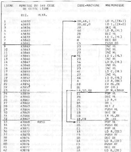 Le premier bloc remarquable va des lignes 1 à 8, et initialise le compteur. Nous aurons en effet besoin d'être avertis si tout le tableau est parcouru sans qu'il y ait d'inversion, signe que le programme est terminé. En réalité, il suffira d'atteindre l'avant-dernier élément du tableau, puisqu'il aura alors été comparé au suivant, c'est-à-dire au dernier. La valeur qui va nous intéresser est donc : Lignes 1 et 2 Ligne 3 Décrémentation de HL qui est maintenant pointé sur II (gardez bien à l'esprit les pointages successifs de HL). Ligne 4 Chargement du contenu de l'emplacement mémoire sur lequel est pointé HL dans le registre B. Ce dernier contient donc maintenant l'octet fort du nombre d'éléments du tableau. Lignes 5 et 6 Même principe pour charger l'octet faible dans C. Après cette ligne, BC contient le nombre d'éléments du tableau. Lignes 7 et 8 Décrémentation de BC (puisque nous voulons obtenir la valeur (nombre d'éléments –1)), puis sauvegarde par empilement. Le deuxième bloc va des lignes 9 à 23 et effectue les tâches suivantes : initialisation des pointeurs, démarrage des passes, comparaison des éléments et branchement en fonction du résultat : Lignes 9,10 et 11 Trois incrémentations successives de HL qui se retrouve pointé sur IV. Lignes 12,13 et 14 Suivant un principe analogue à celui des lignes 4, 5 et 6, l'adresse du premier élément du tableau est chargée dans DE. Lignes 15 à 19 Toujours selon le même principe, l'adresse de l'élément suivant du tableau est chargé dans BC. Ligne 20 Le contenu de l'emplacement mémoire adressé par BC est chargé dans A, qui contient donc maintenant le code ASCII de la première lettre du deuxième élément du tableau. Ligne 21 Échange de DE et HL. Ce dernier se retrouve pointé sur l'emplacement mémoire contenant le code ASCII de la première lettre du premier élément du tableau, et DE se retrouve pointé sur VIII. Ligne 22 Comparaison entre A et (HL), donc entre les deux codes ASCII. Rappelons brièvement le principe de cette comparaison (qui a déjà été étudiée dans d'autres programmes). Ligne 23 Saut à l'adresse 43869 (ligne 33) si négatif. A cette adresse commence en effet le bloc chargé de l'inversion. Voyons d'abord le cas où cette inversion n'est pas nécessaire et où le saut est ignoré : Ligne 24 L'état actuel du compteur est récupéré et chargé dans HL. Lignes 25, 26 et 27 Après une décrémentation de HL, on vérifie si son contenu est ou n'est pas égal à 0 (selon un principe déjà étudié dans le programme de pause, lignes 6, 7 et 8). Ligne 28 Retour de sous-programme si nul : si HL = 0, donc si le tableau a été parcouru jusqu'à l'avant-dernier élément sans qu'il y ait eu besoin d'inversion, le tableau est rangé correctement, et le programme est terminé. Sinon, cette instruction est ignorée. Ligne 29 Sauvegarde de la nouvelle valeur du compteur. Ligne 30 Décrémentation de DE qui, depuis la ligne 21, était pointé sur VIII et l'est maintenant sur VII. Ligne 31 Échange de HL et DE : HL est pointé sur VII. Ligne 32 Saut relatif de - 24 en ligne 12. La boucle va donc reprendre, mais le pointage dans le tableau sera décalé d'un élément (au premier tour, la comparaison se fera entre les éléments 1 et 2, au deuxième tour entre les éléments 2 et 3, au quatrième tour entre les éléments 3 et 4, etc.). Si cette boucle est exécutée (nombre d'éléments – 1) fois sans inversion, le programme retournera au BASIC en ligne 28. Mais attention : à chaque inversion, le processus doit reprendre depuis le début, et le compteur devra être en particulier réinitialisé. 1. Sauvegarder les contenus de VI, VII et VIII. Rappelons qu'au moment où le branchement vers ce bloc se fait, en ligne 23, DE était pointé sur VIII. Ligne 33 La valeur actuelle du compteur ne nous intéresse plus, puisque celui-ci devra être réinitialisé. C'est pourquoi nous l'enlevons de la pile. Lignes 34 et 35 HL est, comme DE, pointé sur VIII. Lignes 36 à 42 Elles réalisent la sauvegarde des contenus de VI, VII et VIII. Ces lignes ne nécessitent aucune explication particulière : vous connaissez toutes les instructions utilisées, et il suffit de suivre attentivement, si possible en les notant, l'état de la pile et l'évolution du contenu des registres. Une remarque cependant : vous pourrez constater que sont ui- A les deux instructions suivantes: "PUSH AF" et "POP AF" Vous n'avez jamais encore entendu parler de ce registre double AF ! En réalité, seul le contenu de A nous intéresse, et pas du tout celui de F Mais comme il est impossible d'empiler un registre simple, nous somm obligés d'empiler le registre double AF, en nous disant que A l'est par la même occasion. Lignes 43 à 46 Comme précédemment, ce bloc, qui réalise le transfert des contenus de V, IV et III dans VIII et V, s'explique de lui-même. L'instruction de transfert répétitif avec décrémentation, déjà plusieurs fois étudiée, est en particulier utilisée. Lignes 47 à 55 Là encore, rien de particuier. Ce bloc réalise évidemment le transfert des contenus initiaux de VIII, VII et VI dans V, IV et III. L'inversion des deux descripteurs de chaîne est terminée. Ligne 56 Puisqu'une inversion a eu lieu, tout le processus doit être repris : saut relatif de - 67, en ligne 1. 100 DIM TABLEAU$ (24) La ligne 100 crée un tableau de 25 éléments. |