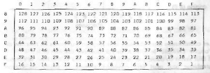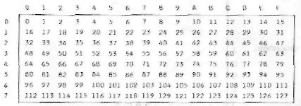 L'octet correspondant à une valeur de saut est constitué par la lettre ou le chiffre en regard de la valeur choisie dans le tableau, sur la colonne de gauche, et par la lettre ou le chiffre en regard sur la ligne du haut.