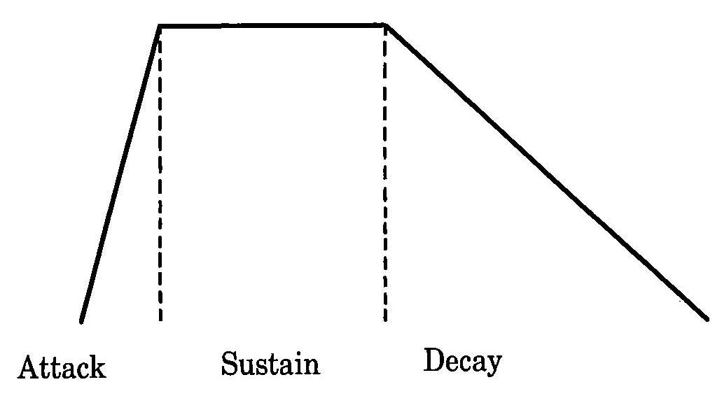 Real sounds rarely have a constant volume. Enveloping allows an approximation to the variation in volume of real sounds to be made. The sound is split into a number of sections each of which can increase the volume, decrease the volume, or keep it constant. The length of these sections can be varied, as can the rate of increase or decrease in volume. For example, a note generated by a musical instrument may be considered to have 3 sections as follows: Attack: The volume of the note rises rapidly to its peak. Sustain: The volume of the note remains constant while the note is played. Decay: The volume falls away slowly to zero as the note finishes.