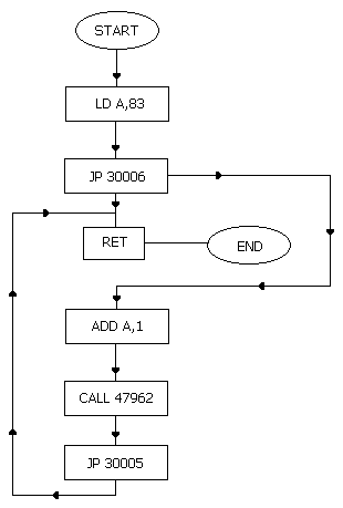 Figure 2.1 Utilisation de JP dans un programme Une telle routine de saut n'accomplit en fait pas grand chose, mais elle pourrait, par exemple, être utilisée pour imbriquer un peu de code dans un programme. En figure 2.1 par exemple, les commandes ' ADD A,1', 'CALL 47962' et 'JP 30005' on été effectivement insérées dans le programme. Nous allons maintenant taper ce programme sur l'ordinateur. N'oubliez pas de tapez ENTER à la fin de chaque ligne, et de sélectionner ' l'pour commencer à entrer un programme, et d'entrer 10 comme numéro de ligne de départ. Notez bien que la première ligne du programme n'est pas ENT. Etant donné que le programme saute à des cases mémoire spécifique, le départ exact du programme doit être connu. ORG 30000 fait que l'assembleur stocke le code machine en mémoire, en commençant à la case mémoire 30000. Reportez-vous à l'annexe 6 pour plus de détails. PROGRAMMES 2.1 ORG 30000 LD A,83 JP 30006 RET ADD A,1 CALL 47962 JP 30005Maintenant assemblez le programme avec l'option A, sélectionnez l'option 2.L'affichage de l'écran du programme devrait ressembler à quelque chose comme ça : ------------------------------------------------ ! CASE ! NUMERO ! CODE ! CODE ! ! MÉMOIRE ! DE LIGNE ! OBJET ! SOURCE ! ------------------------------------------------ ! 7530 ! 10 ! ! ORG 30000 ! ! 7530 ! 20 ! 3E53 ! LD A,83 ! ! 7532 ! 30 ! C33675 ! JP 30006 ! ! 7535 ! 40 ! C9 ! RET ! ! 7536 ! 50 ! C601 ! ADD A,1 ! ! 7538 ! 60 ! CD5ABB ! CALL 47962! ! 753B ! 70 ! C33575 ! JP 30005 ! ------------------------------------------------FIGURE 2.2Le premier nombre dans la colonne case mémoire semble ne pas correspondre à 30000, là où le programme devrait commencer. C'est parce que les cases mémoire sont représentées en hexadécimal. Ne vous en occupez pas pour le moment, rappelez-vous simplement que 30000 est 7530 en hexadécimal, 30006 est 7536 et 30005 est 7535. Quand des sauts sont utilisés de cette manière, il est nécessaire d'indiquer qu programme l'endroit où il doit sauter, soit une adresse, d'où JP 30006. Le calcul de ces adresses est tout ce qu'il y a de plus simple si on le fait systématiquement, comme nous le démontrerons plus loin. Observez la figure 2.2, les nombres et les lettres dans la deuxième colonne, le code objet, sont ce à quoi ressemble le langage assembleur après qu'il ait été assemblé - soit le code machine. Chaque paire de caractère alphanumériques (autrement dit de nombre et/ou de lettres) dans cette colonne représente une partie du langage assembleur initial. Ainsi, '3E' représente 'LD A' et '53' représente '83' (Ne vous demandez pas pour quelle raison! C'est en hexadécimal et nous l'expliquerons dans un chapitre ultérieur.) Pour les nombres en langage assembleur plus grands que 255, quatre alphanumériques - code machine sont requis. Ainsi, 'C3' représente 'JP' et '3075' représente '30000'. Comment cela peut-il nous aider à calculer les adresses auxquelles il faut sauter ? Hé bien, chaque paire de chiffre remplit une case mémoire - un octet de mémoire. Par conséquent, puisque l'ont sait que la première instruction du programme se trouve ne case mémoire 30000 (grâce à ORG 30000), il nous suffit de compter les paires d'alphanumérique - code machine. Par exemple, pour sauter à l'instruction ' ADD A,1', il nous faudrait sauter à la case mémoire contenant 'C6'. Donc, en commençant par 30000, qui contient '3E', nous avons 53, C3, 36, 75, C9, et puis C6. Il y a donc 6 cases mémoire à compter de 30000, c'est donc en 30006. Par conséquent le programme devra sauter à 30006. Il est convenu qu'avant d'entrer 30006 dans les instructions JP, ce ne sera pas à vous de calculer '3675'. Malgré cela, comme vous savez que l'adresse en code machine sera composée de quatre caractères (deux octets), cela ne vous posera pas de problème à condition d'écrire votre programme sur une feuille avant de le taper, - ce qui est une bonne méthode de toute façon. Les annexes contiennent des tables indiquant combien d'octets sont requis par chaque instruction, ce qui vous aidera à calculer les adresses de sauts. Voici une décomposition du programme: ORG ;N'utilise pas de mémoire, il est là pour être utilisé par l'assembleur, et ; on l'appelle une 'directive assembleur' LD A,83 Demande 2 octets - le premier est le code objet pour LD A, et le second est la ; donnée. JP 30006 Demande 3 octets - un pour son code objet, C3, les deux autres sont la case ; mémoire à laquelle il faut sauter. RET ;Ne demande qu'un octet pour son code objet, C9. ADD A,1 Demande 2 octets. Le premier, C6, est le code objet pour 'ADD A', et le second est la ; donnée. CALL 47962 Cette instruction demande 3 octets, CD est le code objet et 5A et BB la case mémoire ; qui est appelé. JP 30005 C'est la même chose que JP 30006, sauf que la case mémoire à laquelle il faut ; sauter est différente. En comptant le nombre d'octets nous pouvons calculer la longueur du programme: le programme 2.1 est long de 14 octets. En utilisant l'opérateur JP nous pouvons sauter dans toute case mémoire de 0 à 65535. Si la case mémoire à laquelle il faut sauter est située entre +129 ou -126 octets par rapport à la case mémoire actuelle, on peut utiliser le saut relatif au lieu de l'instruction de saut. L'avantage de cette instruction alternative est qu'elle est plus rapide, puisqu'elle utilise deux octets seulement en mémoire par opposition aux trois octets qu'utilise l'instruction JP. JR e Saut (JumP) relatif à l'adresse e Par exemple, si vous êtes à l'adresse 30000,et que vous voulez sauter à l'adresse 30045, vous écrirez JR 30045 Vous ne direz pas JR 39, l'ordinateur calculera automatiquement le décalage sur un octet. Notez bien que JR ne peut être utilisé que si vous sauter à une adresse allant de +129 ou -126 de la case mémoire contenant le 'JR' proprement dit. LE REGISTRE D'INSTRUCTION Avant d'aller plus loin, il faut observer la façon 