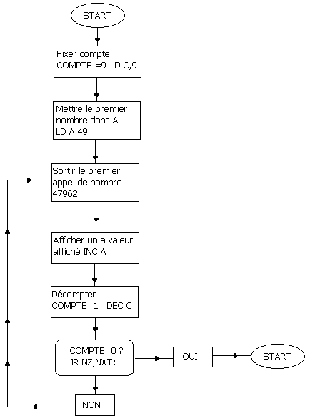 Traduit en un programme, cela donne : PROGRAMME 2.4 ENT ;Fixe le début du programme, LD C,9 Charger dans C le nombre de caractères à inscrire, soit 9, LD A,49 Charge dans A le code de "1", NXT: CALL 47962 Affiche le contenu de l'accumulateur sur l'écran, INC A Ajoute 1 au contenu de A, chargeant ainsi dans A le code de "2" DEC C Décrémente le registre d'instructions, JR NZ,NXT: Si DEC C a un résultat autre que zéro, faire un saut relatif à la case adressée ; Par l'étiquette NXT. RET ;Si C=0 alors retour a l'assembleur. Avant de le lancer, examinons-le étape par étape: --------------------------------------------------- !Numéro ! Accumulateur ! Registre C ! Flag Z ! !d'étape ! ; ! ; ! ;! --------------------------------------------------- ! 1 ! 49 ! 9 ! 0 ! ! 2 ! 50 ! 8 ! 0 ! ! 3 ! 51 ! 7 ! 0 ! ! 4 ! 52 ! 6 ! 0 ! ! 5 ! 53 ! 5 ! 0 ! ! 6 ! 54 ! 4 ! 0 ! ! 7 ! 55 ! 3 ! 0 ! ! 8 ! 56 ! 2 ! 0 ! ! 9 ! 57 ! 1 ! 0 ! ! 10 ! 58 ! 0 ! 1 ! ----------------------------------------------------le flag Z est mis (1)le programme se termine et revient à l'assembleur, (Etape 10)Maintenant assemblez et lancez le programme. EXERCICE 2.3 Ecrivez un programme qui inscrira l'alphabet sur l'écran. (Pour vous aider, sachez que le code de A est 65). Une réponse possible est donnée au chapitre solutions. Jusque là, seul le flag zéro, un des 9 flags possibles, a été utilisé. Voici les autres. LES FLAGS Le flag de retenue (Carry Flag (C)) Ce flag est mis lorsque une addition ou une soustraction a pour résultat une retenue. Il est aussi utilisé dans certaines instructions de décalage et de rotation. Flag de soustraction (N) Ce flag est plutôt utilisé par le Z80 que par des programmes pour certaines opérations arithmétiques. Flag de Parité/Dépassement (P/V) Ce flag a deux fonctions distinctes, la première pour indiquer la parité d'un résultat. La "parité" du résultat est obtenue en ajoutant tous les Uns de sa représentation binaire. Si le résultat est pair alors la parité est mise, sinon elles est annulée, c'est à dire = 0. Le flag est également mis lorsque des dépassements se produisent lors de certaines opérations arithmétiques. Le flag de demi-retenue (H) Le flag de demi-retenue est utilisé par le Z80 pour des Instructions "Décimales Codées en Binaires", Ne vous en occupez pas pour le moment. Le flag Zéro (Z) Le flag zéro est mis lorsque une opération a pour résultat zéro, et en tant que tel, est utilisé très souvent pour des comparaisons. Le flag Signe (S) Ce flag indique le signe du résultat arithmétique ou d'un octet qui est transmis. Fondamentalement, il teste le bit 7 d'un octet, et il est mis s'il est égal a un et annulé dans l'autre cas. SOUS-PROGRAMMES De même que nous avons comparé l'Instruction JP avec l'instruction BASIC IF X=Y THEN 500, il existe une instruction Z80 similaire à l'instruction BASIC GOSUB 500. Cette instruction, CALL, a déjà été utilisée pour inscrire le contenu de l'accumulateur sur l'écran. CALL nn Appel (CALL) de la routine commençant à l'adresse mémoire nn ; (nn peut être représenté par une étiquette). Comme en BASIC, une instruction de retour (return) est requise a la fin du sous-programme. RET ; Retour du sous-programme appelé en dernier. Voyons comment ces instructions peuvent être utilisées dans un programme. Problème : Inscrire sur l'écran les caractères ASCII de 200 a 250, en utilisant un sous-programme 'imprimer les caractères'. PROGRAMME 2.5 ; ENT ; LD A,200 A= 1er code ASCII ; LD B,50 ;B= compte NXT: CALL PRINT: Appel routine d'impression DEC B ;Décrémenter le compte ; INC A ;Code ASCII suivant ; JR NZ,NXT: Si B=0 sauter a NXT ; RET PRINT: CALL 47962 ; RET Assemblez-le puis lancez-le. Pour aider à la compréhension du programme l'étiquette PRINT a été assignée au sous-programme d'impression. Outre les appels inconditionnels il existe des appels conditionnels, de même qu'il y a des sauts conditionnels et inconditionnels. CALL cc,nn ; Appel du sous-programme commençant à l'adresse mémoire nn, si la condition ce est remplie. Les conditions oui font que la routine est appelée sont exactement les mêmes que celles utilisées pour des sauts conditionnels. Lorsqu'une instruction CALL est exécutée, le contenu actuel du registre d'instructions est sauvegardé. Le registre d'instructions reçoit alors l'adresse d'appel nn, Quand le Z80 a terminé le sous-programme, c'est à dire a atteint une instruction RET, le registre d'instructions reçoit la valeur sauvegardée du registre d'instructions. Problème : Afficher 100 "A" sur l'écran, mais afficher un espace pour chaque dizaine de A affichée. Problème : Inscrire sur l'écran les caractères ASCII de 200 à 250, en utilisant un sous-programme 'imprimer les caractères'. PROGRAMME 2.5 ; ENT ; LD A,200 A= 1er code ASCII ; LD B,50 ;B= compte NXT: CALL PRINT: Appel routine d'Impression DEC B ;Décrémenter le compte ; INC A ;Code ASCII suivant ; JR NZ,NXT: Si B=0 sauter à NXT ; RET ; CALL 47962 ; RET Assemblez-le puis lancez-le. Pour aider à la compréhension du programme l'étiquette PRINT a été assignée au sous-programme d'impression. Outre les appels inconditionnels il existe des appels conditionnels, de même qu'il y a des sauts conditionnels et inconditionnels. CALL cc,nn Appel du sous-programme commençant à l'adresse mémoire nn, ; si la condition ce est remplie. Les conditions qui font que la routine est appelée sont exactement les mêmes que celles utilisées pour des sauts conditionnels. Lorsqu'une instruction CALL est exécutée, le contenu actuel du registre d'instructions est sauvegardé. Le registre d'instructions reçoit alors l'adresse d'appel nn. Quand le Z80 a terminé le sous-programme, c'est à dire a atteint une instruction RET, le registre d'instructions reçoit la valeur sauvegardée du registre d'instructions. Problème Afficher 100 "A" sur l'écran, mais afficher un espace pour ; chaque dizaine de A affichée. Rep