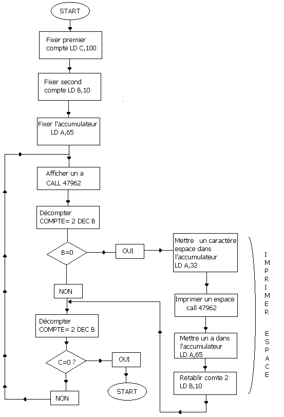 Figure 2.5 Conversion en programme : ; ENT ; LD C,100 C= 1er compte ; LD B,10 ;B= 2ème compte ; LD A,65 ;A= "A" NXT: CALL 47962 Affiche un 'A' DEC B ; CALL Z,PSPC Si B=0 afficher un espace DEC C ; JR NZ,NXT: 100 'A' sont affichés? Si non, sauter à l'espace ; suivant (NXT). ; RET ; Retour a l'assembleur PSPC: LD A,32 ;A=ASCII pour un espace. ; CALL 47962 Afficher un espace ; LD A,65 ;A="A" ; LD B,10 ;Recharger B comme compte ; RET ; Retour au programme principalEssayez maintenant de lancer le programme et voilà, une centaine de A apparaissent sur l'écran séparés tous les 10 par un espace. Cette forme d'appel conditionnel est très pratique car elle facilite considérablement récriture de programmes structurés.RESUME Le compteur de programme (PC) est un registre de 16 bits, contenant l'adresse mémoire de l'instruction en cours à l'intérieur du programme. Le registre de flags contient 8 bits, qui reflètent l'état de la section arithmétique du Z80. Des étiquettes peuvent être utilisées dans les Instructions de saut. Une étiquette doit contenir moins de sept caractères, et être terminée par un double point immédiatement suivi par un espace. Il existe deux formes principales de sauts, conditionnelle et inconditionnelle. Ces deux formes peuvent être encore divisées chacune en sauts absolus, c'est a dire, JP NXT ou sauts relatifs: JR NXT. Deux types d'appel de sous-programmes (CALL) existent, conditionnel et inconditionnel. Toute instruction d'appel doit être associée à une instruction RET. Il existe deux formes principales de sauts, conditionnelle et inconditionnelle. Ces deux formes peuvent être encore divisées en sauts absolus, c'est à dire, JP NXT ou saut relatif :JR NXT. Deux types d'appel (CALL) existent, conditionnel et inconditionnel. Toute instruction d'appel doit être associée à une instruction RET. Dans un contexte, vous comprendrez la liste suivante d'instructions, même si vous ne comprenez pas tout a fait les conditions de flag. JP nn JP cc,nn JR e JR Z,e JR NZ,e nn est une adresse absolue ou une étiquette ce est l'un des opérandes indiquant quel flag doit être testé est une adresse absolue, sauf qu'elle est limitée à -126 ou +129 octets à partir de l'adresse en cours. Une étiquette peut également être utilisée. ce condition NZ Non-Zéro Z Zéro NC Pas de retenue C Retenue PO Parité impaire PE Parité paire P Positif M Négatif Et aussi : INC r DEC r Où r est un registre de 8 bits parmi ceux-ci: B,C,D,E,H,L,A. On peut mieux définir opérande et opérateur en utilisant un exemple: LD ;A,83---------- ! ; ! ; ! ------------ -------------- ! ! opérateur! ! opérande 1 ! ! ------------ -------------- ! ; -------------- ; ! opérande 2 ! ; --------------CPCrulez[Content Management System] v8.732-desktop/c Page créée en 141 millisecondes et consultée 3034 foisL'Amstrad CPC est une machine 8 bits à base d'un Z80 à 4MHz. Le premier de la gamme fut le CPC 464 en 1984, équipé d'un lecteur de cassettes intégré il se plaçait en concurrent du Commodore C64 beaucoup plus compliqué à utiliser et plus cher. Ce fut un réel succès et sorti cette même années le CPC 664 équipé d'un lecteur de disquettes trois pouces intégré. Sa vie fut de courte durée puisqu'en 1985 il fut remplacé par le CPC 6128 qui était plus compact, plus soigné et surtout qui avait 128Ko de RAM au lieu de 64Ko. |