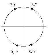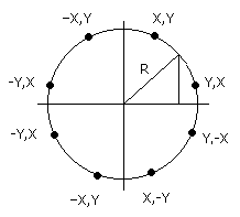 E = 3-2r ;Equ 10.4 T La valeur de E(T) change tout au long du programme suivant le choix du pixel précédent: Si le Pixel A est choisi quand E ; T ;T E = E +4X+6 ; Equ 10.5 T+1 T ou si le pixel B est sélectionné quand E >=0 alors ;T E = E +4(x-y)+10 ; Equ 10.7 T+1 T L'équation 10,5 a besoin de deux additions et deux décalages, l'équation 10.6 de deux additions, une soustraction et deux décalages; un progrès considérable sur les algorithmes précédents. On a besoin d'une méthode pour réfléchir ces points afin de former un cercle complet. Si on peut trouver les valeurs de X et Y pour un quart de cercle, on peut alors produire un cercle complet en réfléchissant ces coordonnées. Voir figure 10.12