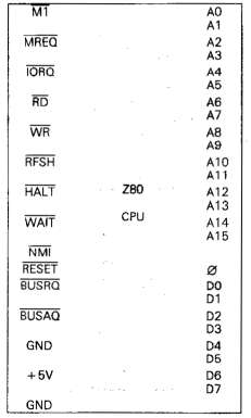 A0 à A15 : Bus d'adresse tristate en sortie actif à l'état haut sur 16 bits. AO est le bit le moins significatif (LSB), et A15 le bit le plus significatif (MSB). D0 à D8 : Bus de données tristate en entrée/sortie actif à l'état haut sur 8 bits. DO est le bit le moins significatif (LSB), et D7 le bit le plus significatif (MSB). M1 Sortie active à l'état bas, signale que le cycle horloge courant est consacré à une identification d'op-code, ou qu'un IORQ est actif. MREQ: Sortie tristate active à l'état bas. Signale que le bus d'adresse est en attente d'une adresse pour lire ou écrire en mémoire. IORQ : Sortie tristate active à l'état bas. Signale l'un des deux événements suivants : - la partie de poids faible du bus d'adresse est en attente d'une adresse pour lire ou pour écrire en mémoire ;