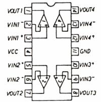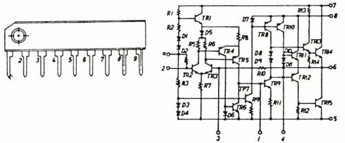 2/5.1 - Les circuits intégrés linéairesLa figure 1 reproduit le brochage du LA 6324, quadruple amplificateur opérationnel dont les différentes sections servent surtout de préamplificateurs de signaux audio. Le LA 4140, dont les caractéristiques apparaissent à la figure 2, est un amplificateur de puissance servant à attaquer le haut-parleur. Il est logé dans un boîtier SIL (Single In Line) ne possédant qu'une seule rangée de broches, mais muni d'un coin coupé évitant toute confusion d'orientation.  Fig 1. : LA 6324
