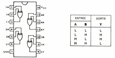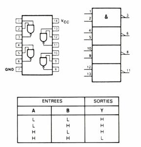 2/5.2 - Les circuits intégrés digitauxQuadruple porte NAND à deux entrées, le ZN 7400 de la figure 1 est logé dans un boîtier à 14 broches que nous représentons accompagné du symbole normalisé « IEC » de sa fonction, et de sa « table de vérité ». Celle-ci permet de constater que la sortie de chaque section ne passe à l'état bas (L soit 0V) que si les deux entrées correspondantes sont ensemble à l'état haut (H soit + 5 V). Il s'agit donc bien du complément logique de la fonction ET (AND). Le 74LS132 de la figure 2 remplit la même fonction logique, mais avec un comportement « trigger de Schmitt », lui permettant de transformer des tensions mal définies en niveaux logiques francs, 0 V ou +5 V.
