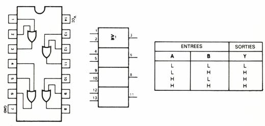 A la figure 3, le 74LS08 réalise la fonction ET (AND), complémentaire de la précédente : la sortie de chaque porte à deux entrées ne passe au niveau haut que si les deux entrées sont elles-mêmes hautes (à + 5 V). Le 74LS32 de la figure 4 est une quadruple porte OU (OR) à deux entrées : la sortie de chaque porte passe à un niveau haut dès qu'au moins une des entrées est haute : on parle d'une fonction « OU inclusif » par opposition au 74LS136 de la figure 5 qui contient quatre portes « OU exclusif à deux entrées : la sortie est haute si une entrée est basse et l'autre haute. Elle est basse si les deux entrées sont au même niveau, quel qu'il soit. A la figure 6, nous sommes en présence d'une triple porte NOR (fonction complémentaire du OU) à 3 entrées 74LS27 : la sortie n'est haute que si les trois entrées correspondantes sont basses en même temps. Le 74HCU04 de la figure 7 est un sextuple inverseur : chaque élément inverse le niveau appliqué à son entrée. Contrairement à tous les circuits précédents dont la sortie délivrait du + 5 V à l'état haut, le 74LS38 de la figure 8 contient quatre portes NAND à deux entrées avec sorties collecteur ouvert : lorsque les deux entrées sont hautes, la sortie correspondante est reliée à la masse par un transistor NPN saturé. Dans les autres cas, le transistor est bloqué et la sortie reste dans un état « haute impédance » : son niveau électrique est fixé par le circuit extérieur.