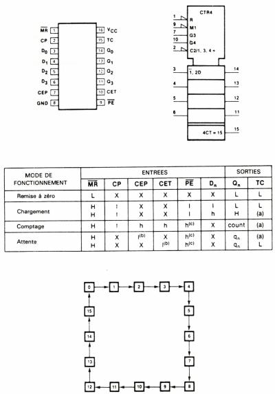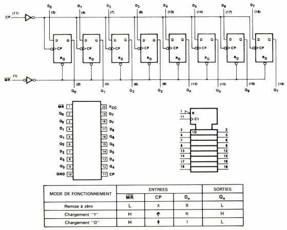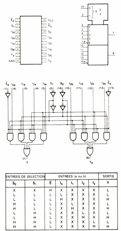 Avec le 74HC240 de la figure 9, nous abordons le domaine des circuits intégrés de moyenne complexité : les huit sections de ce composant sont en effet des buffers trois états inverseurs. Lorsque l'entrée E correspondant à un buffer donné est dans un état haut, la sortie du buffer est en « haute impédance » (Z). L'état de l'entrée de « donnée » I est alors sans importance (X). Lorsque cette entrée E passe au niveau bas, les données appliquées à l'entrée I d'un buffer se retrouvent sur la sortie 0 correspondante, mais inversées. Le 74LS244 de la figure 10 fonctionne de la même façon, mais n'inverse pas les données entre l'entrée et la sortie. Ces deux composants sont séparés en deux groupes A et B de quatre buffers chacun^ maison utilise généralement les huit buffers ensemble, en réunissant Ea et Eb. Le 74LS373 de la figure 11 contient des bascules D en amont des huit buffers qui cette fois sont indissociables au niveau de la commande OE. Cette disposition permet de « saisir au vol » un groupe de huit états sur les entrées, puis de le recopier plus tard sur les sorties, sans inversion cette fois encore. Un état bas sur l'entrée de commande E provoque lamise en mémoire des états des huit entrées, tandis qu'un état bas sur OE déclenche le transfert des états mémorisés vers les sorties. Bien entendu, les huit sorties restent en « haute impédance » tant que OE est à l'état haut. Ce type de composant sert souvent à réaliser des ports de sortie, et les simples buffers des ports d'entrée. Le 74LS273 de la figure 12 n'est pas équipé de buffers : il ne contient que huit bascules qui peuvent mémoriser l'état des entrées lorsqu'une impulsion positive est appliquée à l'entrée d'horloge CP. Toutes les bascules peuvent être remises à zéro simultanément par un niveau bas sur l'entrée MR, ou « Master Reset ». Les entrées du 74LS273 sont évidemment compatibles avec un bus « trois états » comme le bus de données du Z80, mais ses sorties ne le sont pas directement. On peut cependant les utiliser pour créer un port de sortie, par exemple pour l'imprimante. Logé dans un boîtier à 14 broches seulement, le 74LS74 de la figure 13 ne contient que deux bascules, mais équipées d'entrées individuelles de remise à zéro et à un, et aussi de sorties directes et complémentées. A ceci près, le fonctionnement est semblable : le niveau présent sur l'entrée D (Donnée) est transféré et mémorisé sur les sorties pendant le front montant de l'impulsion appliquée à l'entrée C (Clock). Assemblage complexe de bascules, le 74HC161 est un compteur binaire à quatre étages, pouvant donc compter de zéro à quinze. Différentes entrées de commande permettent toute une variété de fonctionnements spéciaux : prépositionnement à un état quelconque grâce aux entrées « D », remise à zéro, mise en attente, etc. La figure 14 résume les principales caractéristiques de ce composant. Décodeur BCD-décimal, le 74LS145 de la figure 1 5 fait passer à l'état bas celle de ses dix sorties qui correspond à la valeur décimale du mot binaire de quatre bits appliquée à ses entrées. Les combinaisons supérieures à 9 sont ignorées. Le 74LS153 de la figure 16 est pour sa part un multiplexeur capable de réaliser deux fois l'aiguillage vers une sortie unique d'une entrée choisie parmi quatre possibles, si E est à 0.