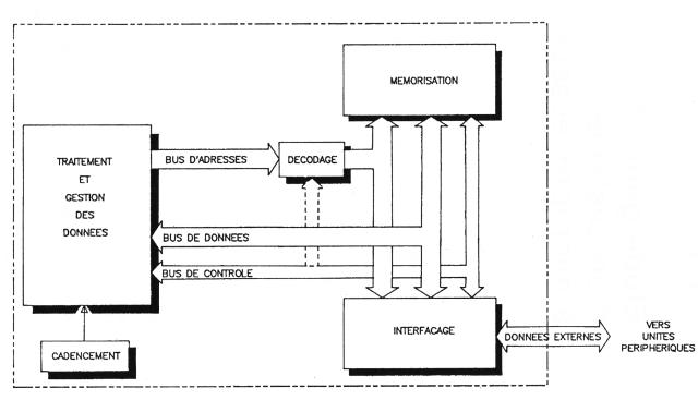 La fonction de cadencement orchestre toutes les opérations effectuées au sein du système et fournit ce que l'on appelle l'horloge du système. Entre toutes ces fonctions, sont effectuées des interactions à l'aide de liaisons filaires groupées sous la dénomination de BUS (bus d'adresses, de données et de contrôle), que nous examinerons plus loin.