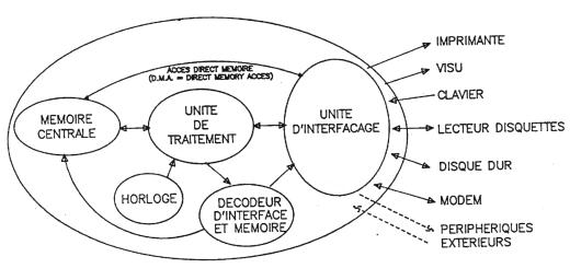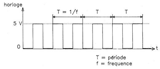 2/7.1 - Etude générale d'un système à microprocesseurII. Les éléments essentiels d'une structure à microprocesseur La figure 2 représente sommairement les différents éléments d'un système informatique. Ce schéma sagittal représente ainsi les différentes structures assurant les fonctions précédemment énumérer, et que nous allons détailler ci-après. L'HORLOGE L'horloge assure la fonction de cadencement, pour l'unité de traitement, et permet une synchronisation de toutes les opérations à effectuer, en fournissant un signal périodique rigoureusement stable (voir Fig. 3) à l'aide en général d'un quartz et de composants logiques annexes. LE DÉCODEUR D'INTERFACE ET DE MÉMOIRE Cette structure est constituée de composants électroniques plus ou moins complexes, et elle est parfois assurée par des liaisons filaires directes (nous le verrons quand nous étudierons le cas de l'Amstrad-CPC). Elle sert à sélectionner le ou les composant(s) impliqué(s) dans un éventuel dialogue avec le microprocesseur, en évitant que d'autres composants soient aussi sélectionnés (par exemple, lors de la lecture d'une donnée dans un composant mémoire, il faut éviter que cette lecture ne s'effectue sur le clavier ou le lecteur de disquette). Nous reparlerons de cette structure plus loin, car elle nécessite quelques notions sur le bus d'adresse et la sélection de composants.