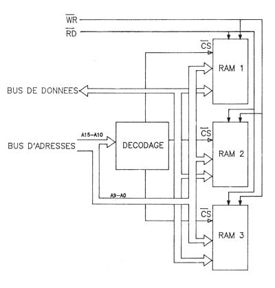 2/7.1 - Etude générale d'un système à microprocesseurIV. L'adressage des données - Le décodage La sélection de boîtier Toutes les données qui seront traitées par un microprocesseur se trouvent, ou se trouveront, dans des composants tels ROM, RAM ou composants d'interfaçage. Lorsque le microprocesseur désirera accéder à une donnée située dans un composant particulier, il ne faut surtout pas que d'autres composants restituent en même temps une des données qu'ils contiennent, de même pour l'écriture, qui doit s'effectuer, généralement dans un seul composant. Pour ce faire, chaque composant possède au moins une broche qui le sélectionne, dénommée selon les cas CS (Chip Select = sélection de boîtier), CE (Chip Enable = validation de boîtier) ou parfois EN (ENable = validation). D'autres composants nécessitent une broche supplémentaire dénommée OE (Output Enable = validation de sortie), comme bien souvent les ROM et les EPROM, qui permet de valider la donnée en sortie du composant. Ainsi, pour lire une donnée située dans un composant d'interfaçage X, il faudra activer ia broche CS de ce composant, et désactiver toutes les broches de validation des boîtiers des autres composants. L'adressage des données - le décodage Rappelons que pour accéder à une donnée, ou la sauvegarder, il faut connaître l'endroit où elle se trouve, c'est-à-dire son adresse. Avec un microprocesseur comportant 16 fils d'adresses, il est possible de réaliser 2 puissance 16 combinaisons différentes sur ces 16 fils, donc 65536 numéros d'adresses différentes (de &0000 à 8FFFF en hexadécimal). A chaque fois qu'il doit manipuler une donnée, le microprocesseur va émettre sur le bus d'adresses le numéro de la case où se trouve la donnée, on appelle cela l'adressage de la donnée. Lorsqu'une adresse est émise, il faut alors qu'un seul composant puisse la fournir. L'adresse fournie doit donc être décodée. Une partie de ce décodage est effectuée par le composant, car il possède des fils d'adresses, mais pas tous. Il faut donc réaliser une autre partie du décodage, en général avec certains, ou tous, fils d'adresses restants, pour sélectionner le boîtier. Prenons pour exemple un boîtier mémoire imaginaire comportant 10 fils d'adresses, un fil de sélection de boîtier, deux broches d'écriture et lecture et un bus de données (voir Fig. 8). Ce boîtier peut adresser de lui-même 2 puissance 10 = 1024 cases internes de huit bits. Avec 65536 cases mémoires possibles pour le Z80, nous pouvons donc placer 65536/1024 = 64 boîtiers mémoires de ce type, autour du microprocesseur. Chaque boîtier devra, par contre, se trouver sélectionner différemment selon l'adresse de la donnée à laquelle on désire accéder. On va donc effectuer un décodage sur les fils d'adresses restants. On pourra décider que le premier boîtier sera ainsi sélectionné lorsque tous les fils d'adresses de A10 à A15 seront à zéro (cette combinaison amenant un zéro sur le CS). Le boîtier numéro 2 sera sélectionné lorsque le fil A10 sera à 1, et les fijs A11 à A15 à zéro (cette combinaison devra amener un zéro sur le CS du deuxième boîtier). De même pour le troisième boîtier avec une combinaison différente et ainsi de suite. Ce décodage sera ainsi effectué grâce à des composants logiques câblés selon une logique dite combinatoire. Après décodage, le premier boîtier mémoire contiendra les données situées aux adresses 000000xxxxxxxxxx — x signifiant n'importe quel état 0 ou 1 — (donc de 0000000000000000 — &0000 — à 0000001111111111 — &03FF). Le deuxième contiendra les données situées aux adresses 000001 xxxxxxxxxx (de 0000010000000000 — &0400 — à 0000011111111111 — &07FF), etc. Supposons maintenant que nous n'ayons besoin que de 3 boîtiers mémoires de ce type.