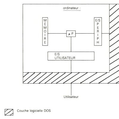 Les systèmes d'exploitation sont des programmes constitués d'un ensemble de fonctions représentées par des mots-clés. Chaque fonction fait l'objet d'un programme d'extension « .COM » stocké sur disque. Facilité et rapidité d'accès aux fichiers sur disque : Pour accéder à un fichier disque, il suffira de donner son nom au DOS. C'est le DOS qui se chargera de le convertir en une adresse physique et d'extraire les données demandées parmi les milliers ou millions d'octets disponibles sur le support magnétique. De même, le DOS sera capable de stocker des données sur disque, rapidement, et là où aucune autre donnée n'est déjà stockée. Il pourra même morceler le fichier soumis pour occuper les « trous » libres sur la disquette si celle-ci est relativement pleine. De plus, le DOS permettra à l'utilisateur de faire le répertoire (DIRECTORY) des fichiers présents sur le support, de supprimer ou de renommer un ou plusieurs fîchier(s). Facilité et rapidité d'accès aux périphériques : Les organes périphériques sont essentiellement le clavier, l'écran, l'imprimante et le lecteur de disquettes. Ils sont reliés à l'ordinateur par des connexions standard, et échangent avec lui des messages selon un protocole de communication. Les différences de protocole entre deux périphériques donnés sont très importantes, et, sans l'aide du DOS, l'utilisateur devrait effectuer une gymnastique intellectuelle pour passer d'un périphérique à un autre. Heureusement, le DOS permet de banaliser les entrées/sorties, de telle sorte que, par exemple, une demande d'impression sur écran ou sur imprimante se fait selon le même format, en précisant seulement quel est l'organe de sortie choisi. De même, la lecture au clavier ou sur lecteur de disquettes est identique, mis à part le nom du périphérique qui émet les données. En conclusion, nous voyons que le DOS est une « couche logicielle » d'interfacage entre la carte mère et les périphériques utilisant un protocole d'échange de haut niveau.